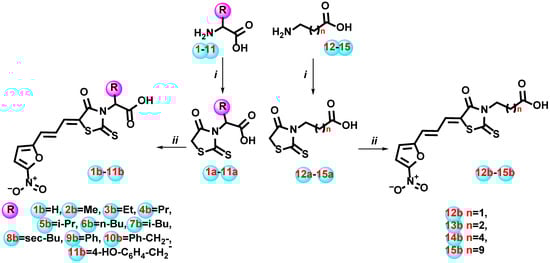 The synthetic design of the reported study was based on diversifying the substituent at the N-3 atom of the 4-thiazolidinone ring with carboxylic group-bearing moieties. The set of commercially available aminoacids 1–15 was used as starting building blocks. Initially, aminoacids 1–15 were subjected to a one-pot reaction of dithiocarbamate generation with CS2 in the basic medium and cyclization by sodium chloroacetate, with treatment by concentrated HCl yielding to derivatives 1a–15a, as presented in Scheme 1. Then, obtained rhodanine-3-carboxylic acids 1a–15a were transformed to the corresponding 5-ylidene derivatives 1b–15b in the Knoevenagel condensation, with 3-(5-nitrofuran-2-yl)acrylaldehyde using as a catalyst an anhydrous sodium acetate in the glacial acetic acid medium with yields of 80–88%.