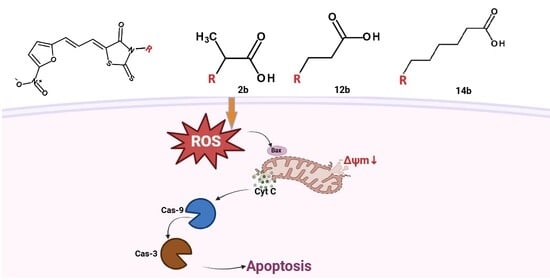 - Elzahhar, P.A.; Nematalla, H.A.; Al-Koussa, H.; Abrahamian, C.; El-Yazbi, A.F.; Bodgi, L.; Bou-Gharios, J.; Azzi, J.; Al Choboq, J.; Labib, H.F.; et al. Inclusion of Nitrofurantoin into the Realm of Cancer Chemotherapy via Biology-Oriented Synthesis and Drug Repurposing. J. Med. Chem. 2023, 66, 4565–4587. [Google Scholar] [CrossRef]