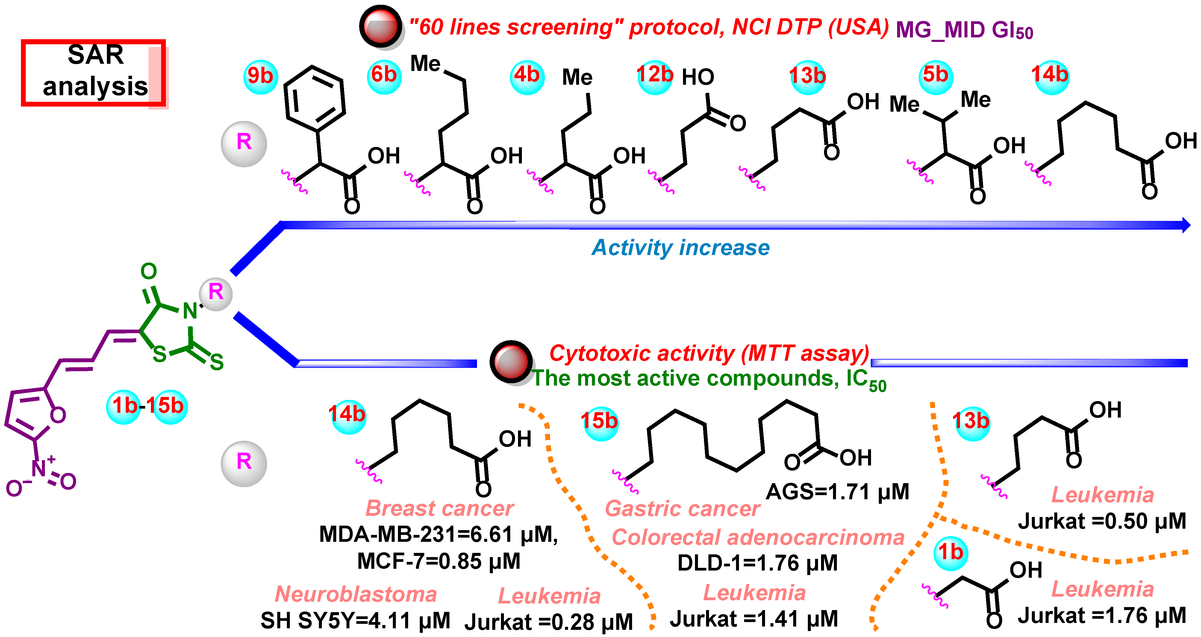 - Buzun, K.; Gornowicz, A.; Lesyk, R.; Kryshchyshyn-Dylevych, A.; Gzella, A.; Czarnomysy, R.; Latacz, G.; Olejarz-Maciej, A.; Handzlik, J.; Bielawski, K.; et al. 2-{5-[(Z,2Z)-2-Chloro-3-(4-nitrophenyl)-2-propenylidene]-4-oxo-2-thioxothiazolidin-3-yl}-3-methylbutanoic Acid as a Potential Anti-Breast Cancer Molecule. Int. J. Mol. Sci. 2022, 23, 4091. [Google Scholar] [CrossRef] [PubMed]