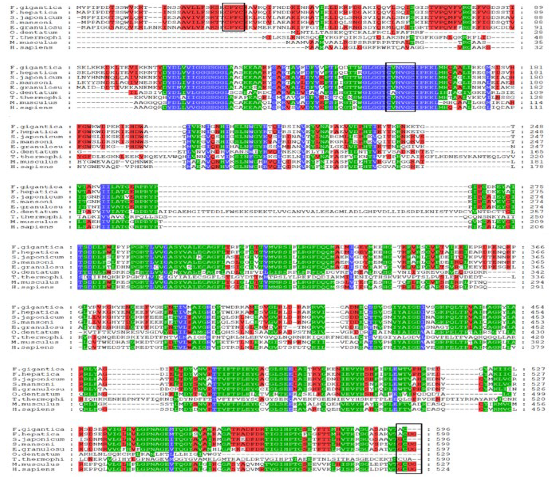 Figure 1. Alignment of the TGR amino acid sequence from F. gigantica with other TGRs and TR from some parasites: F. hepatica CAM96615.1, S. mansoni AAK85233.1, S. japonicum ACH86016.1, E. granulosus AAN63052.1, T. thermophila EAR83786.3, O. dentatum KHJ98088.1, M. musculus AAL90457.1, and H. sapiens AAD19597.1. The three conserved motifs are indicated by the black boxes. The different colors backgrounds indicated conserved and quantify mode colors.