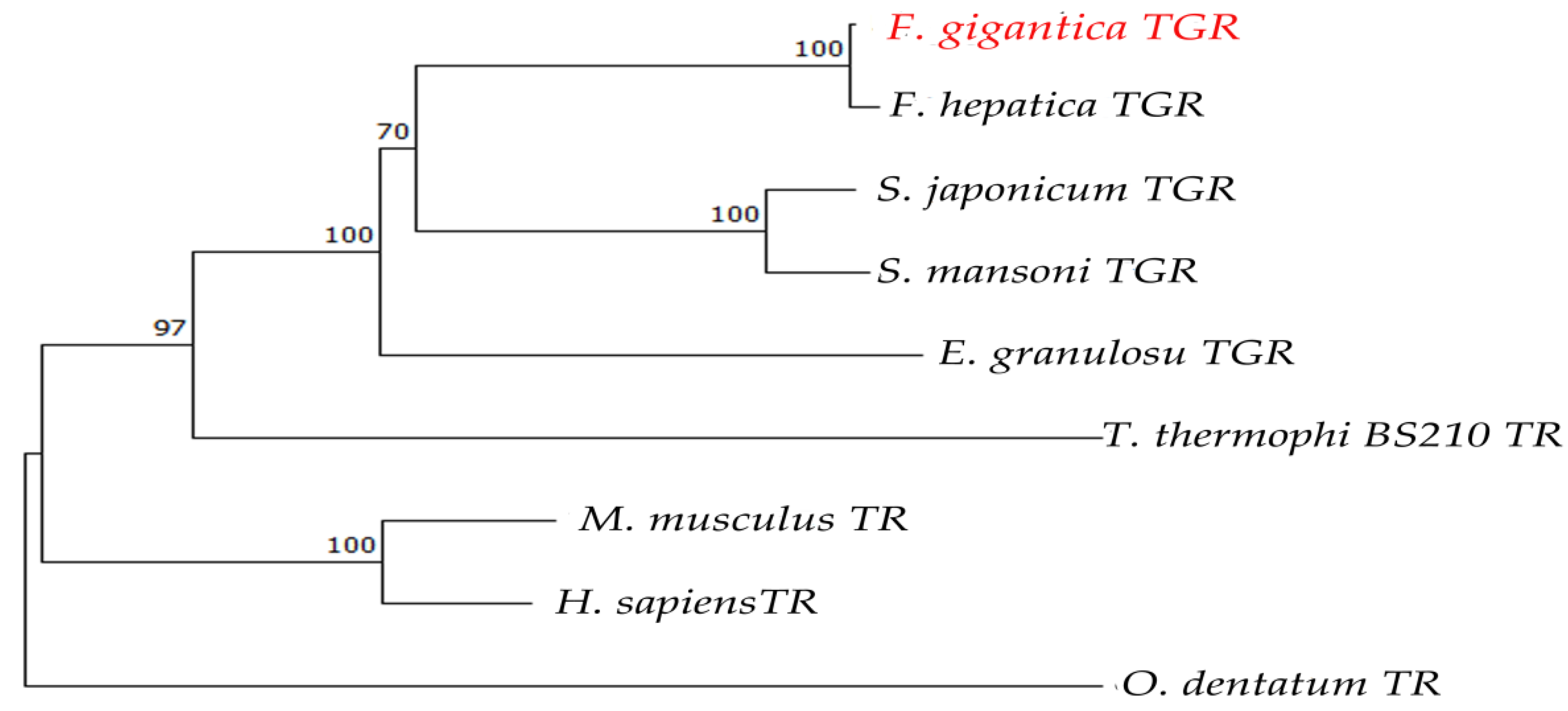 Figure 2. Phylogenetic tree analysis of homologs of TGRs and TR (the accession numbers of TGRs and TR are cited in Figure 1). The red color of F. gigantica TGR was used to highlight the target gene.