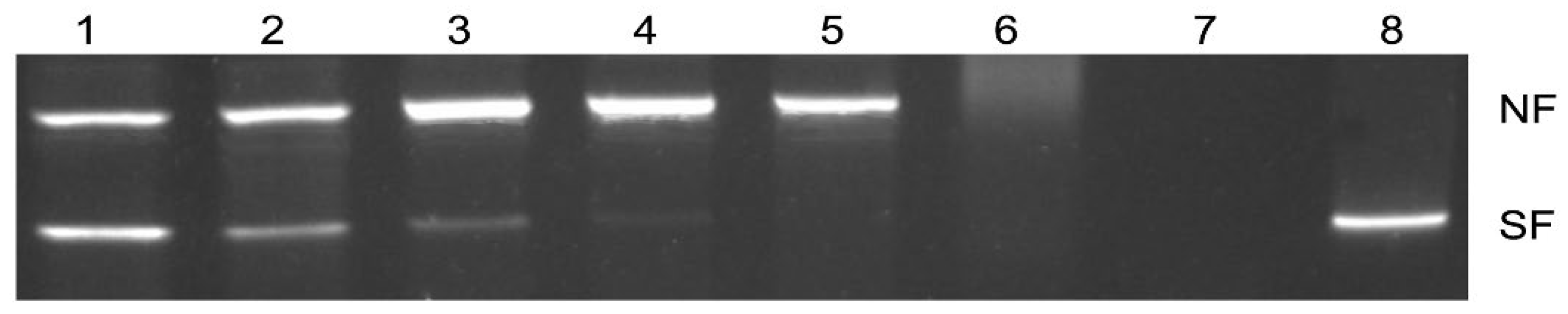 Figure 3. Protection of super-coiled DNA cleavage by FgTGR in an MCO system. Lanes (1–5) pUC19 plasmid + FeCl3 + DTT + FgTGR (12.5, 25, 50, 100, 200 μg/mL, respectively); (6) pUC19 plasmid + FeCl3 + DTT + 200 μg/mL BSA; (7) pUC19 plasmid + FeCl3 + DTT; (8) pUC19 plasmid. NF, nicked form of pUC19 plasmid; SF, super-coiled form of pUC19 plasmid.