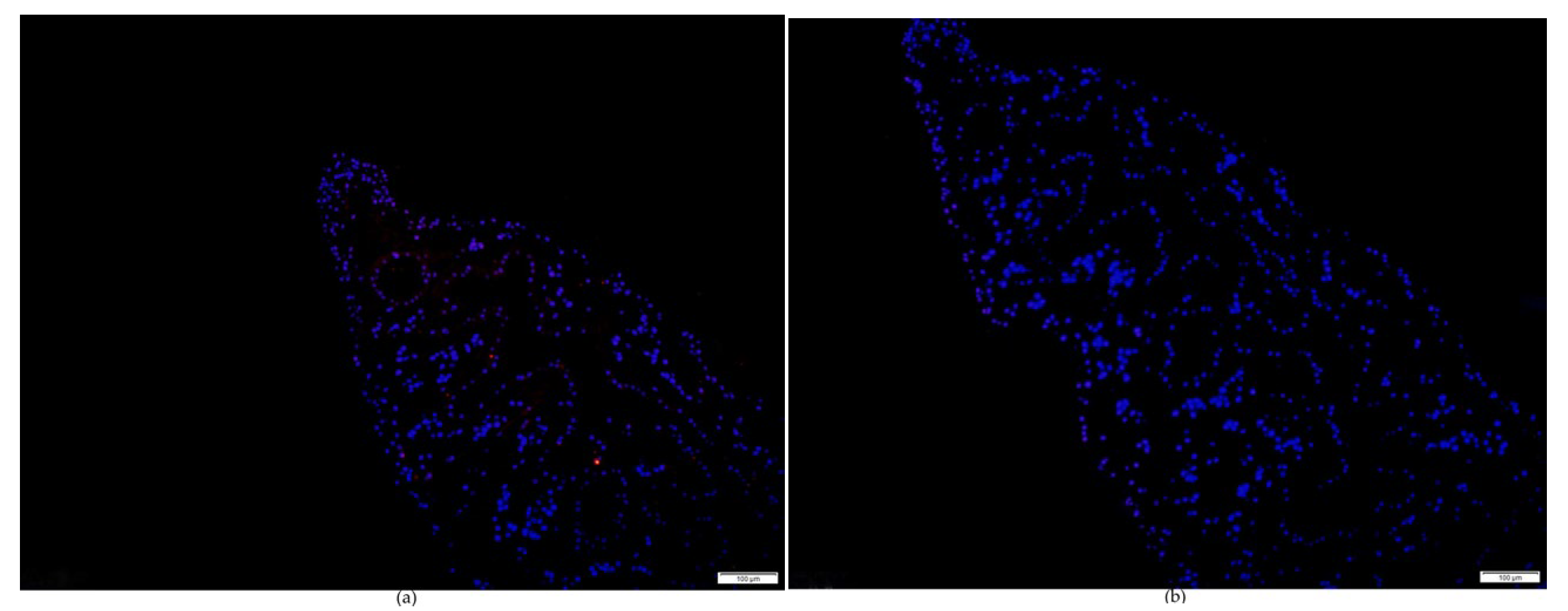 Immunodetection for the TGR protein is shown in Figure 4. The sections were probed with the anti-FgTGR specific antibodies. In the section of adult parasites, a positive signal for FgTGR was detected. Distinct red fluorescence was observed throughout the entire adult specimen (Figure 4a). However, the negative control, using normal mouse serum, did not show a positive signal (Figure 4b).