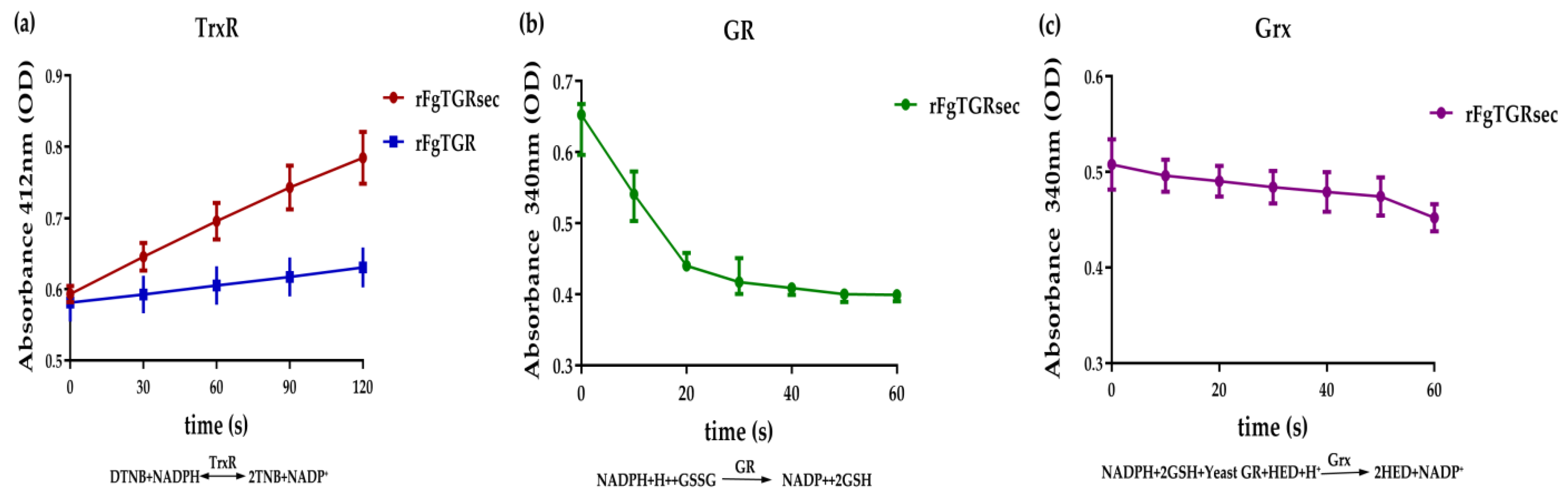 Figure 5. Absorbance of the activity detection analysis of FgTGR and FgTGRsec. (a) Absorbance of FgTGR and FgTGRsec at 412 nm for TrxR activity. (b) Absorbance of FgTGRsec at 340 nm for GR activity. (c) Absorbance of FgTGRsec at 340 nm for Grx activity.