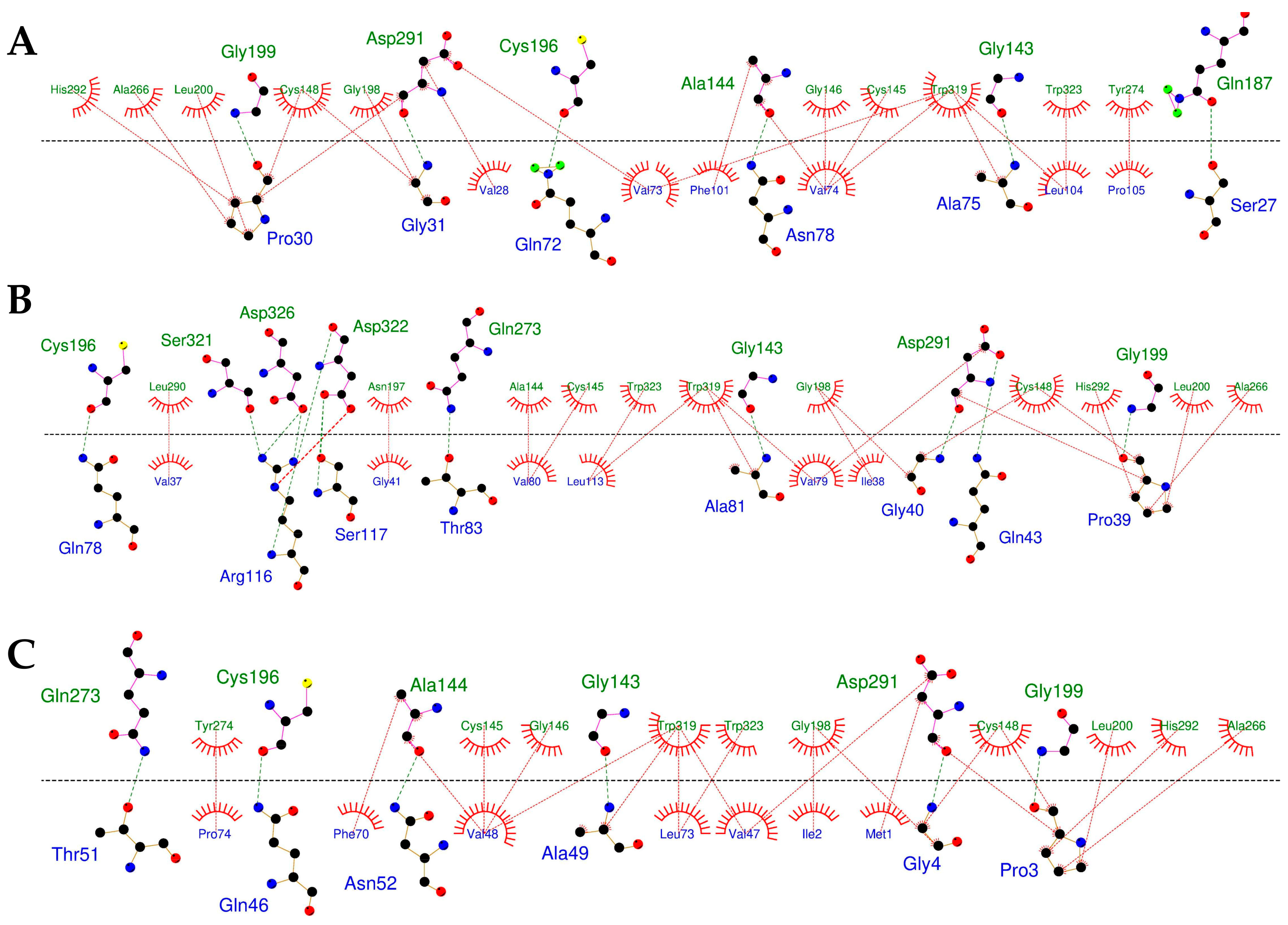 - Laskowski, R.A.; Swindells, M.B. LigPlot+: Multiple Ligand–Protein Interaction Diagrams for Drug Discovery. J. Chem. Inf. Model. 2011, 51, 2778–2786. [Google Scholar] [CrossRef]