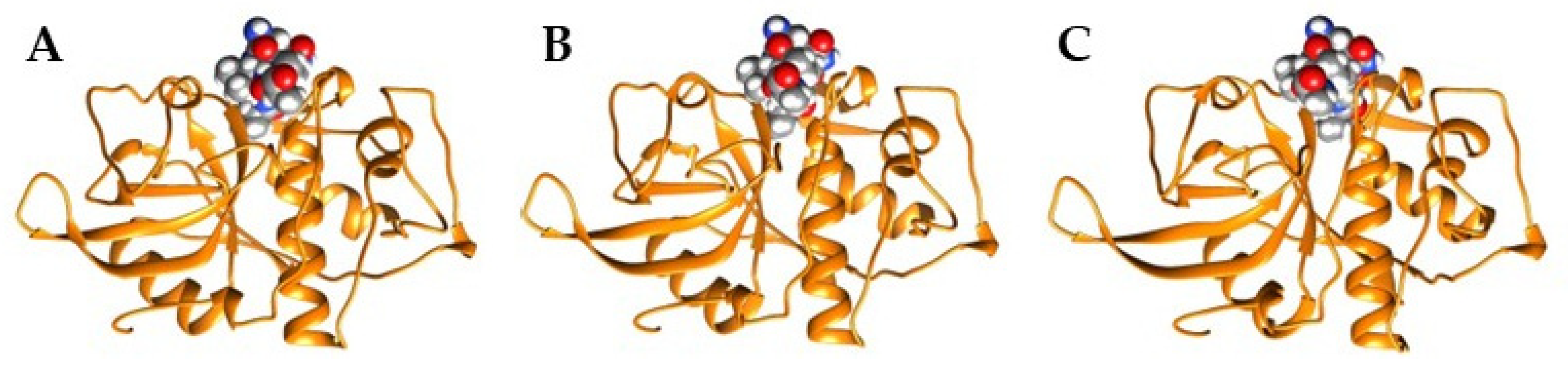 - Pettersen, E.F.; Goddard, T.D.; Huang, C.C.; Couch, G.S.; Greenblatt, D.M.; Meng, E.C.; Ferrin, T.E. UCSF Chimera—A Visualization System for Exploratory Research and Analysis. J. Comput. Chem. 2004, 25, 1605–1612. [Google Scholar] [CrossRef]