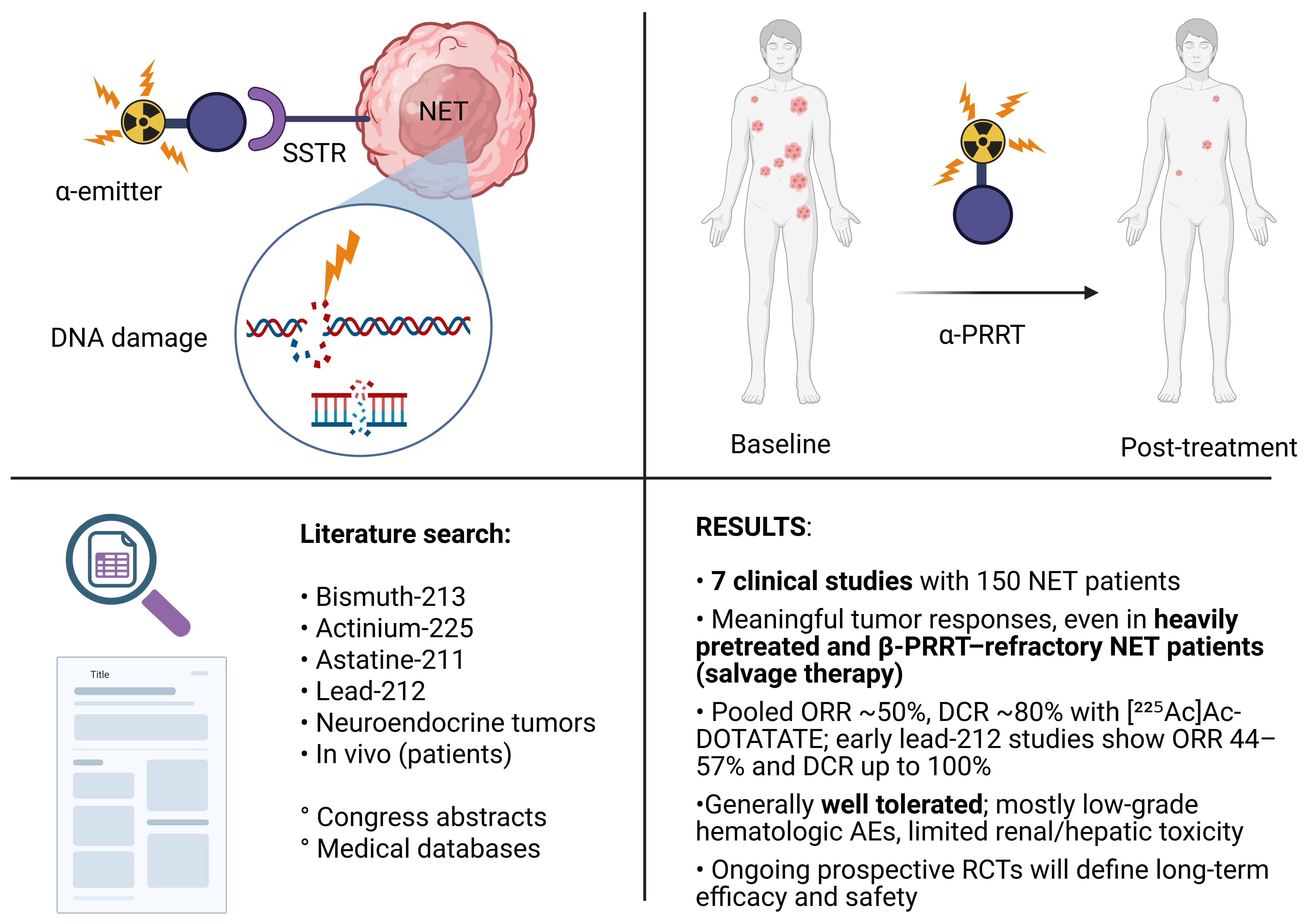 | Orano Med, Alphamedix02 (2021) | NCT05153772 | Phase II | [212Pb]Pb-DOTAMTATE (AlphaMedix) | 2.5 MBq/kg/cycle | Inoperable or metastatic, progressive, well differentiated, SSTR+ NETs (PRRT naïve or with previous PRRT) | 69 | Safety, mPFS, OS, QoL |