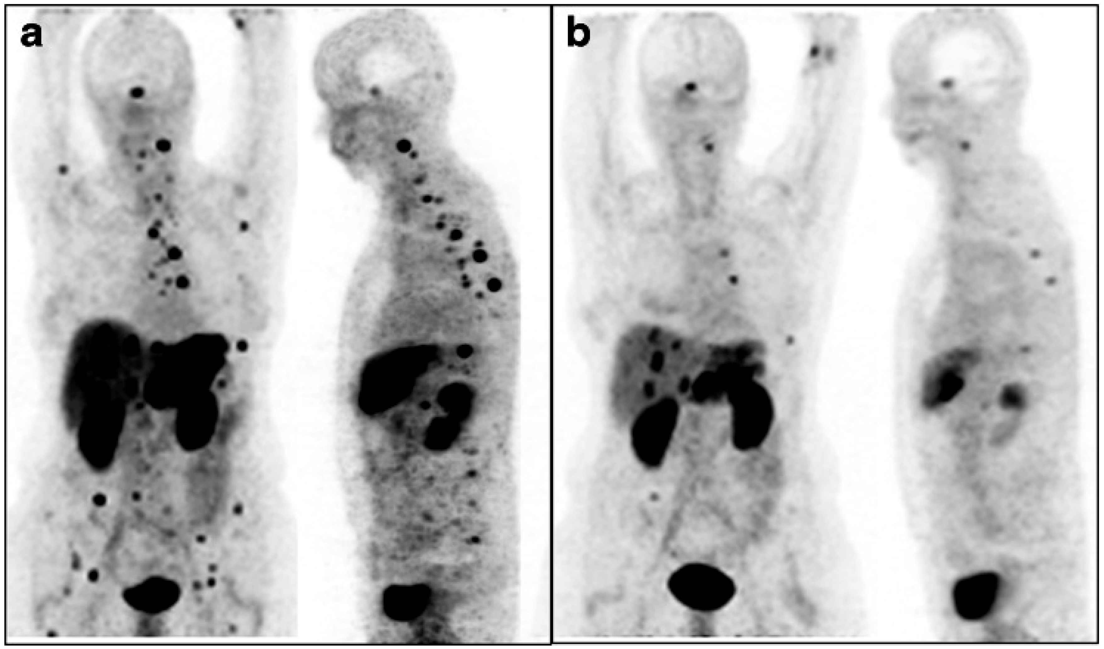 - Bergsma, H.; Van Lom, K.; Raaijmakers, M.H.G.P.; Konijnenberg, M.; Boen, B.; Teunissen, J.; de Herder, W.; Krenning, E.; Kwekkeboom, D. Persistent hematologic dysfunction after peptide receptor radionuclide therapy with 177Lu-DOTATATE: Incidence, course, and predicting factors in patients with gastroenteropancreatic neuroendocrine tumors. J. Nucl. Med. 2018, 59, 452–458. [Google Scholar] [CrossRef]