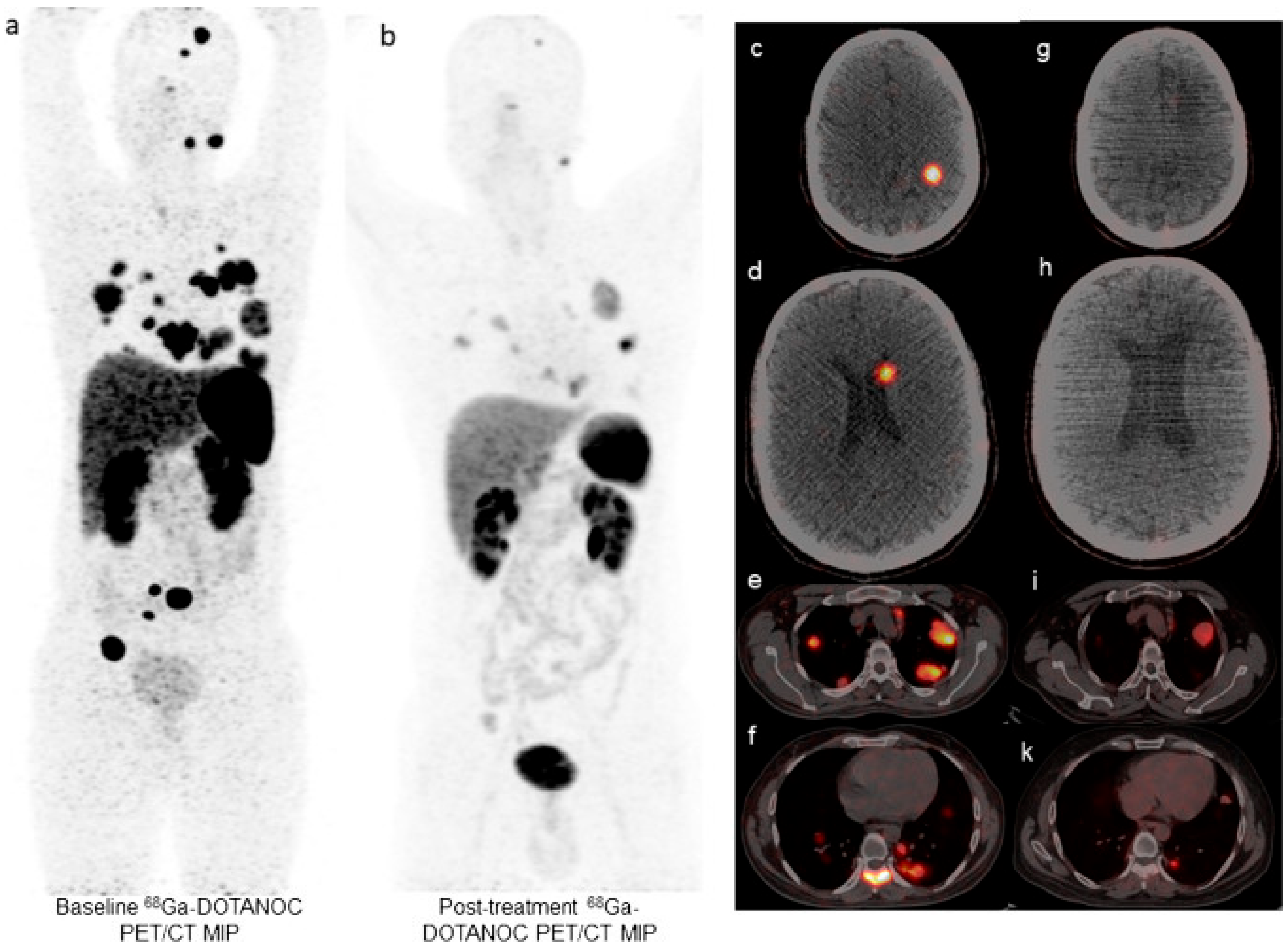 - Buscombe, J.R.; Caplin, M.E.; Hilson, A.J. Long-Term Efficacy of High-Activity 111 In-Pentetreotide Therapy in Patients with Disseminated Neuroendocrine Tumors. J. Nucl. Med. 2003, 44, 1–6. [Google Scholar]
