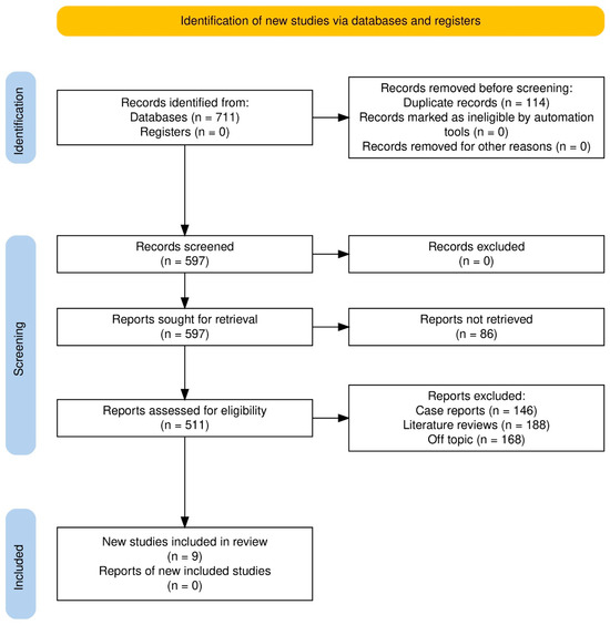 We collected 711 records from the databases and 0 from registers (Figure 1); 114 duplicates were excluded before title/abstract screening, leaving us with the 597 original records (Figure 1). Title/abstract screening excluded no records, so retrieval of all 597 reports was attempted; 86 were unavailable. Full-text eligibility assessment was performed on 511 reports, whereupon 502 were excluded (n = 146 case reports, n = 188 literature reviews, n = 168 off-topic). We included nine studies [11,12,20,21,22,23,24,25,26], and none of the other included studies’ reports were found.