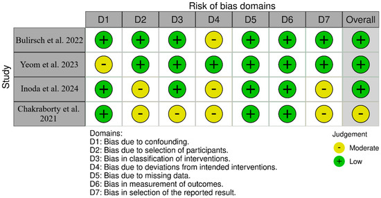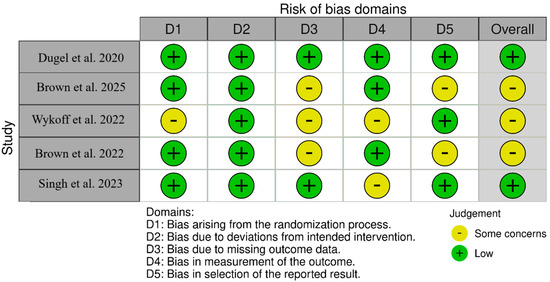For non-randomized studies (ROBINS-I), as shown in Figure 2, SHIFT [20] had low overall risk with moderate concerns about deviations from intended interventions (D4). Yeom et al. [21] had low overall risk with moderate concerns about confounding (D1) and selection of the reported result (D7). Inoda et al. [22] had low overall risk with moderate concerns about selection of participants (D2) and deviations (D4). BRAILLE [23] had moderate overall risk due to moderate concerns in D2, D3, D4, and D7. For randomized trials (RoB 2-Figure 3), HAWK [11] was low-risk across all; HARRIER [11] had some concerns due to randomization (D1) and measurement (D4); MERLIN [12] had some concerns due to missing outcome data (D3) and selective reporting (D5); KESTREL [24] and KITE [24,25] each had some concerns across the domains of randomization and measurement; and KINGFISHER [26] had low overall risk with some isolated concerns regarding measurement (D4).