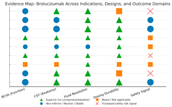 A recent systematic review and meta-analysis of brolucizumab in DME and diabetic retinopathy found that brolucizumab significantly improved BCVA and central subfield macular thickness (CSMT) relative to comparator anti-VEGFs [27]. The pooled mean differences favored brolucizumab: MD −0.64 (95% CI −1.15 to −0.13) in logMAR BCVA (p = 0.01) and MD −138.6 µm (95% CI −151.9 to −125.3) in CSMT (p < 0.00001). The authors concluded that brolucizumab offers potential efficacy advantages (visual gain, retinal drying, and extended dosing intervals) over other agents in DME/DR. However, they cautioned that sight-threatening adverse events occurred more frequently with brolucizumab (notably retinal vasculitis), especially at the 3 mg dose (no randomized comparisons were made between different brolucizumab doses). Overall, the evidence supports the effectiveness of brolucizumab for DME, consistent with its regulatory approval for use in adults.