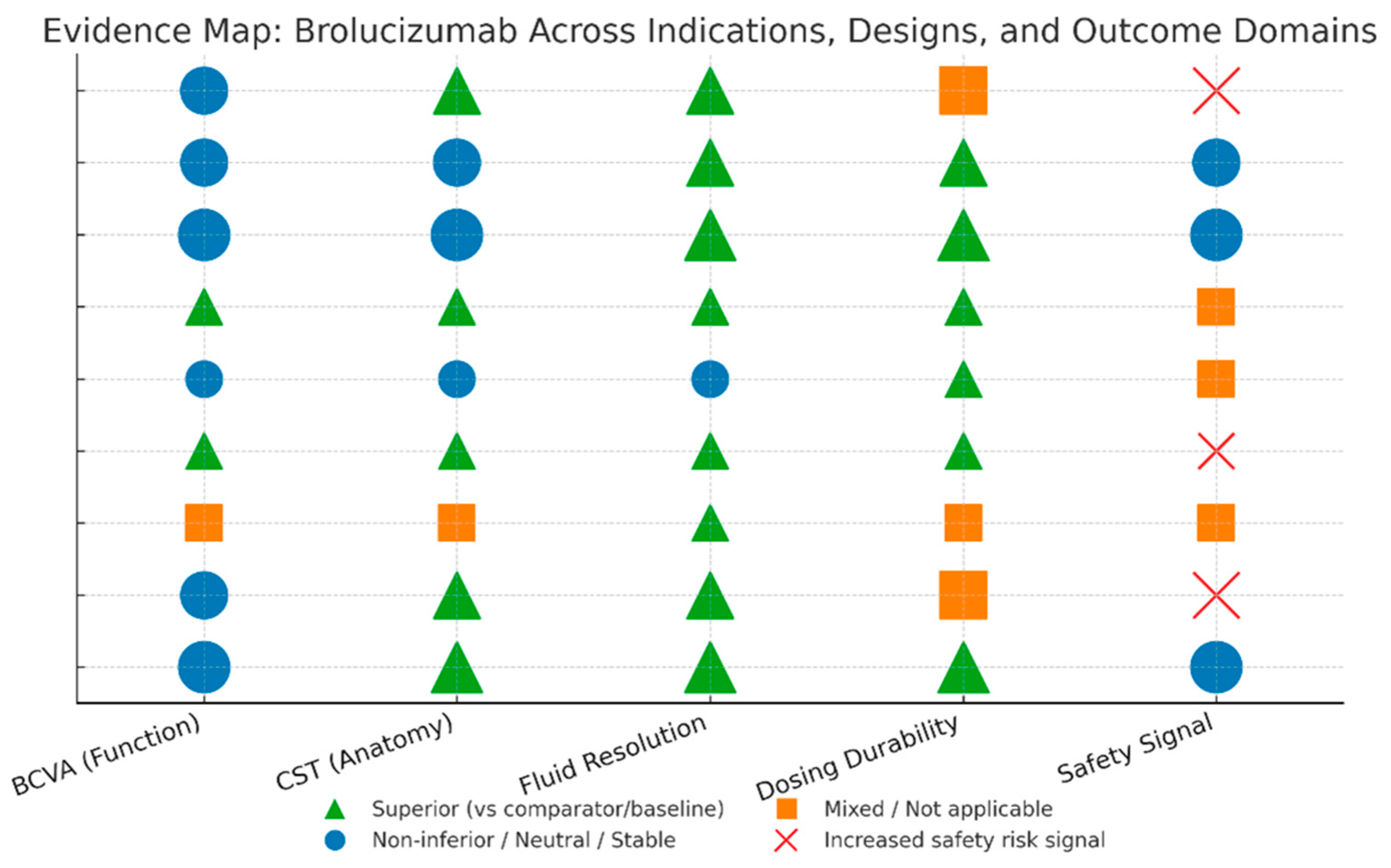 - Chuan, J.; Liu, L.; Feng, Y.; Wang, M.; Li, G.; Lv, Q. The Efficacy and Safety of Brolucizumab for the Treatment of nAMD: A Systematic Review and Meta-Analysis. Front. Pharmacol. 2022, 13, 890732. [Google Scholar] [CrossRef] [PubMed] [PubMed Central]