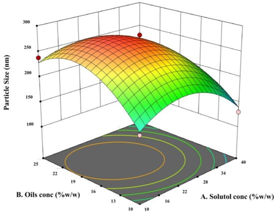 Particle Size = −881.80069 + 10.82292 (Solutol conc) + 39.01056 (Oils conc) + 58.67861× (Amount of drugs) − 0.102222 (Solutol conc × Oils conc) − 0.004778 (Solutol conc × Amount of drugs) − 0.084000 (Oils conc × Amount of drugs) − 0.212639 (Solutol conc2) − 0.915667 (Oils conc2) − 1.23589 (Amount of drugs2)
