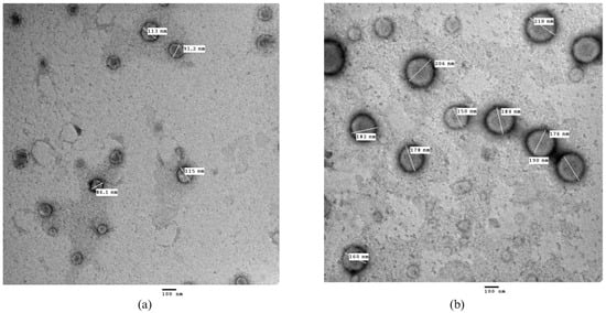 As evident in Figure 3, the nanocapsules displayed spherical, non-aggregated morphology with a narrow size distribution, comparable to results reported by other researchers [52,53]. The PS obtained using the TEM imaging concurred with the PS results obtained by the particle size analyzer for At-Cu LNCs (97.98 ± 2.27 nm) and for the FA-At-Cu LNCs (181.60 ± 2.83 nm).
