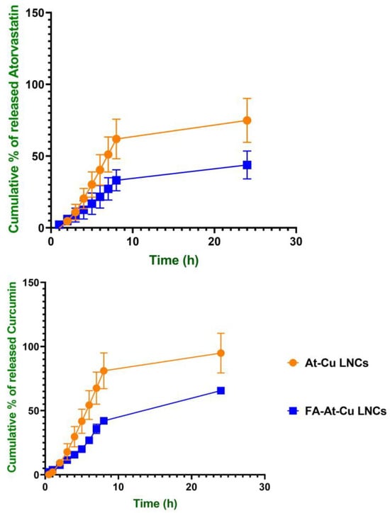 The observed reduction in drug release from FA-At-Cu LNCs within 24 h, compared to unmodified counterparts, may be attributed to multiple interrelated factors. Firstly, surface functionalization with FA enhances the interfacial stability of the nanocapsule through improved steric and electrostatic stabilization, which reinforces the structural integrity of the lipid shell and limits drug diffusion [60,61,62]. Additionally, at physiological pH (7.4), FA remains largely ionized, contributing to a hydrophilic surface layer that hinders the outward migration of lipophilic compounds such as curcumin and atorvastatin. Several studies have highlighted the pH-dependent drug release characteristics of nanocarriers modified with FA, underscoring the promise of such delivery systems in the context of cancer treatment [63,64,65].