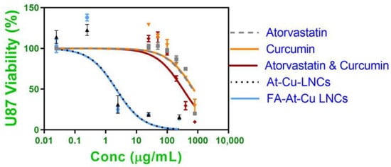 Viability of U87 cells treated for 24 h with At-Cu LNCs (0–250 µg/mL), FA-At-Cu LNCs (0–250 µg/mL), Free atorvastatin solution (0–800 µg/mL), Free curcumin solution (0–800 µg/mL) and Free atorvastatin & curcumin solution (0–800 µg/mL). Symbols represent mean values ± S.D. of cell viability at each concentration, and lines represent non-linear regression fitting of the dose response curve.