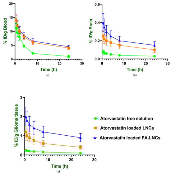 Biodistribution profiles of atorvastatin in blood, brain, and glioma tissue over 24 h following intravenous administration of atorvastatin in free solution and lipidic nanocapsules in glioma-bearing mice in: (a) Blood (b) Brain and (c) Glioma tissue. Data are expressed as % injected dose per gram of tissue (% ID/g).