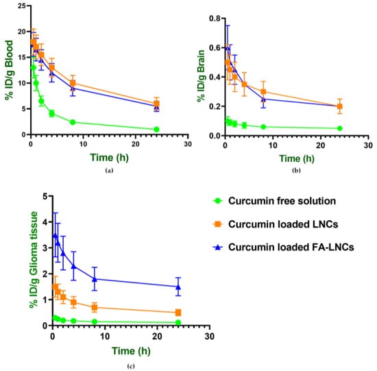 Biodistribution profiles of curcumin in blood, brain, and glioma tissue over 24 h following intravenous administration of curcumin in free solution and lipidic nanocapsules in glioma-bearing mice in: (a) Blood, (b) Brain and (c) Glioma tissue. Data are expressed as % injected dose per gram of tissue (% ID/g).