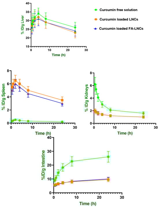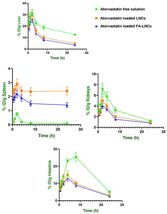 For curcumin in particular, lipidic nanocapsules markedly reduced hepatic clearance compared to the free drug solution, whereas splenic clearance was increased for both drugs. Additionally, both drugs showed reduced renal and intestinal AUC values when encapsulated. Curcumin’s kidney AUC decreased significantly (p < 0.05) from 57.87 ± 12.47 to 29.50 ± 6.53 %ID*h/g tissue, and atorvastatin’s from 75.39 ± 14.24 to 50.98 ± 8.84 and 41.95 ± 7.16 %ID*h/g tissue for LNCs and FA-LNCs, respectively, further confirming a shift in elimination from renal pathways to MPS-dominated mechanisms.