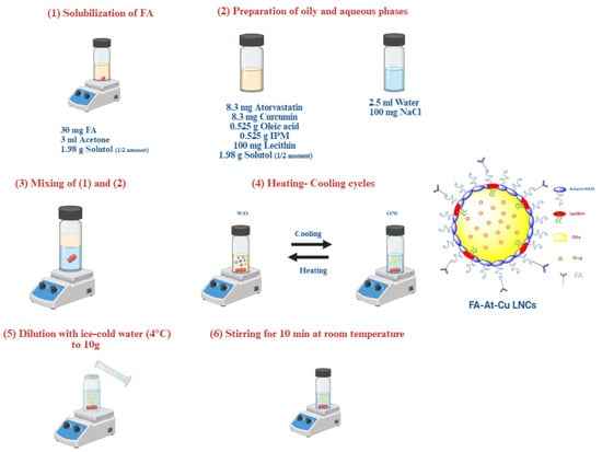 Schematic illustration for the method of preparation of FA-At-Cu LNCs.