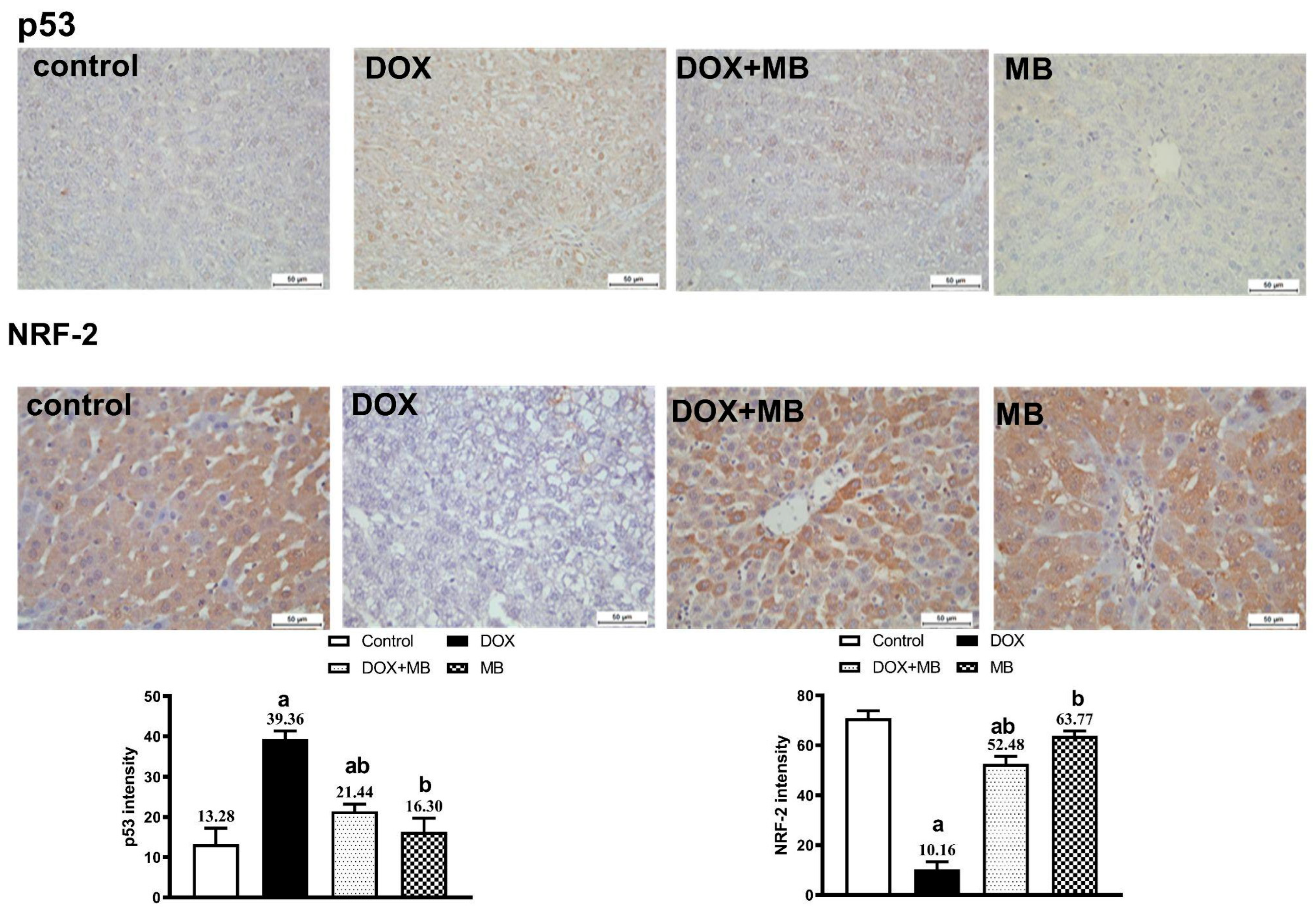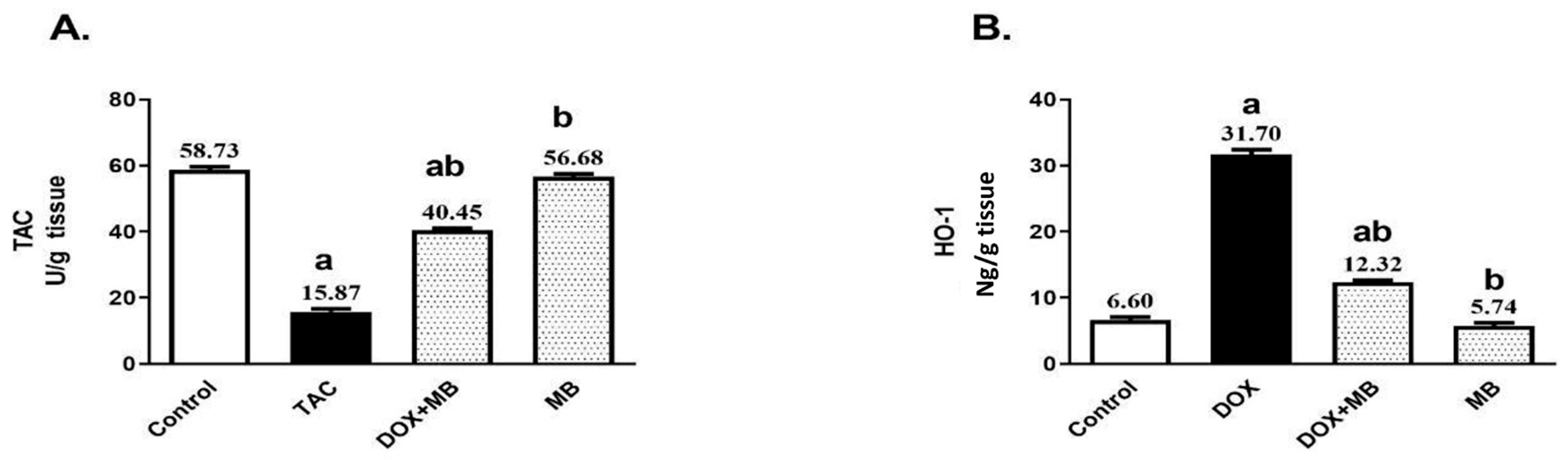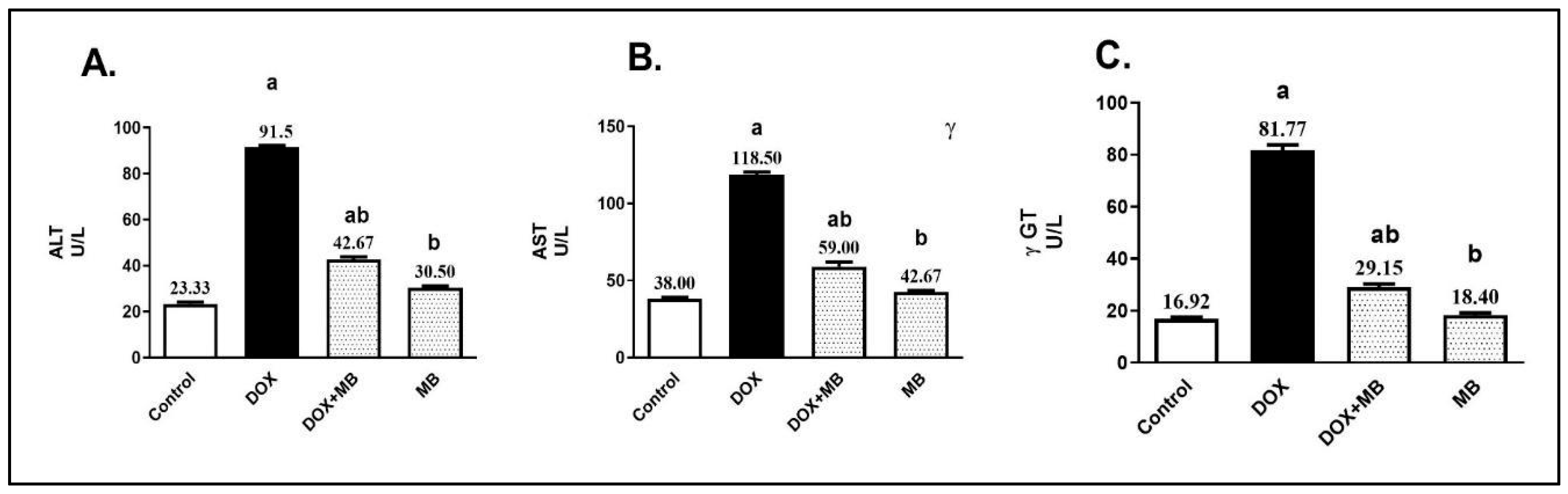 2.1. Effect of MB on DOX-Induced Hepatic Dysfunction