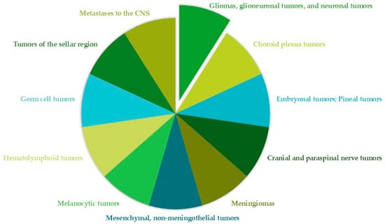 The fifth edition of the WHO Classification of Tumors of the CNS, published in 2021, classifies brain tumors into 12 main categories [25], summarized in Figure 1.