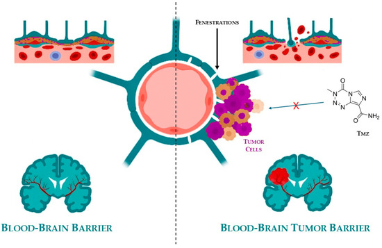 In addition to the well-established BBB, brain tumors develop a secondary protective layer known as the blood–brain tumor barrier (BBTB), shown in Figure 3.