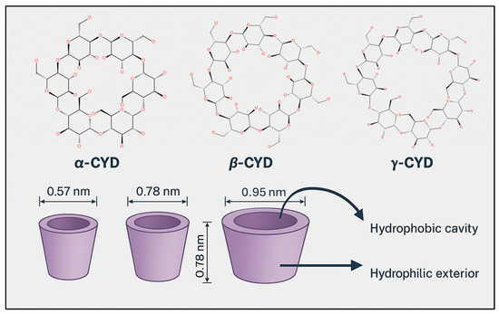 CYDs are cyclic oligosaccharides typically composed of six to eight α-D-glucopyranose units connected via α-1,4-glycosidic bonds. Their distinctive molecular geometry resembles a truncated cone, featuring a hydrophilic exterior and a hydrophobic inner cavity. This structural arrangement allows CYDs to encapsulate a wide range of guest molecules, thereby enhancing their physicochemical properties such as solubility, stability, and permeability [13,14]. In pharmaceutical formulations, CYDs are widely employed as excipients due to their ability to improve the solubility and bioavailability of poorly water-soluble drugs [15]. More recently, their role has expanded into oncology, where CYDs have attracted growing interest for their potential to overcome drug resistance mechanisms and facilitate targeted delivery of therapeutic agents to cancer cells.