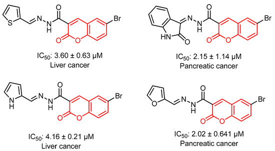 Coumarin (2H-1-benzopyran-2-one) was first isolated from the Tonka bean (Dipteryx odorata) of the Fabaceae family in 1820 [15]. Coumarin derivatives are found as secondary metabolites in many plant species, most commonly in the families of Rutaceae, Apiaceae, Fabaceae and Asteraceae [16]. They can be isolated as novobiocin and aflatoxin from some microbial sources. Approximately 80% of the anticancer drugs in use are natural compounds [17]. Many researchers have extensively investigated the various mechanisms of coumarin-based anticancer agents, including molecular hybridizations [18]. In the search for new anticancer drugs, natural products are always an important source. Many coumarin derivatives obtained from natural products show important anticancer activity [19,20,21]. Moreover, the concept of molecular hybridization can provide efficient results in treatment with a coumarin moiety, as it may lead to the production of new anticancer drugs with lower toxicity, improved specificity, and increased efficacy [22]. Figure 1 shows some coumarin derivatives which possess anticancer activity [23].