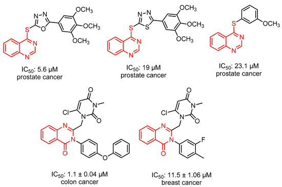 Quinazoline molecules have been identified as a preferred group of multi-acting therapeutic agents within the pharmaceutical and biological domains. The ease with which it can be prepared, in addition to its diverse pharmacological activity, has led to its significant importance among the various therapeutic agents available. The fundamental approach to the development of novel agents with anticancer activity involves the placement of different substituents at the 4, 6, and 7-positions of the quinazoline system [24,25]. According to the literature, many quinazoline derivatives have been found to have anticancer activity due to their high selectivity and low toxicity [26,27] (Figure 2).