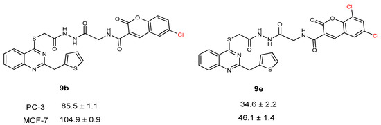 When the activity of compounds 9b and 9e was compared, the addition of two chlorine atoms at the 5th and 7th position of the coumarin ring enhanced the anticancer activity against both prostate and breast cancer cell lines (Figure 6).