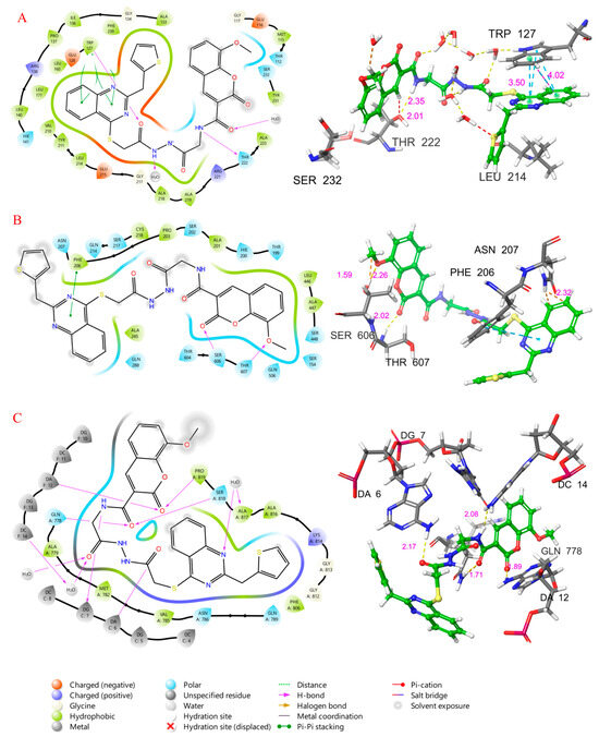 Two-dimensional and 3D ligand interaction diagram of compound 9f at the binding site of EG5 (A), Human Ribonucleotide Reductase (B), and Topoisomerase II (C).