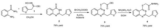 The synthetic routes for preparing target hybrid molecules were carried out in three steps. In the first step, firstly, ethyl 2-(thiophen-2-yl)acetamide hydrochloride (1) was prepared as described in the literature [43]. Secondly, 2-aminothiobenzamide was reacted with compound 1 to obtain 2-(thiophen-3-ylmethyl)quinazoline-4(3H)-thione (2). Then, compound 2 was treated with ethyl bromoacetate to obtain ethyl {[2-(thiophen-2-ylmethyl)quinazolin-4-yl]sulfanyl}acetate (3). Lastly, compound 3 was reacted with hydrazine monohydrate to obtain 2-{[2-(thiophen-2-ylmethyl)quinazolin-4-yl]sulfanyl}acetohydrazide (4), which is the first intermediate for the target hybrid compounds (Scheme 1).
