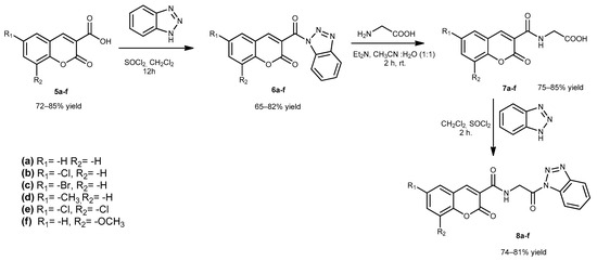 In the second step, firstly, compounds 5a–f and 6a–f were obtained according to our previous studies [34]. Then, compounds 6a–f were reacted with glycine to obtain compounds 7a–f. Then, compounds 7a–f were reacted with 1H-benzotriazole in dichloromethane to obtain glycine-conjugated coumarin benzotriazole compounds 8a–f, which are the second intermediate for the target compounds (Scheme 2).