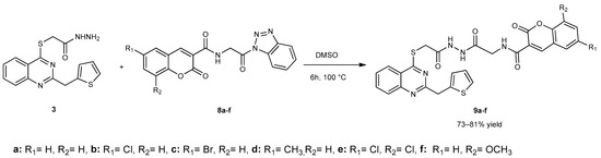 In the last step, compounds 7a–f were reacted with compound 3 in dimethyl sulfoxide to obtain glycine-conjugated hybrid compounds containing quinazolinone, thiophene, and coumarin moieties (Scheme 3).