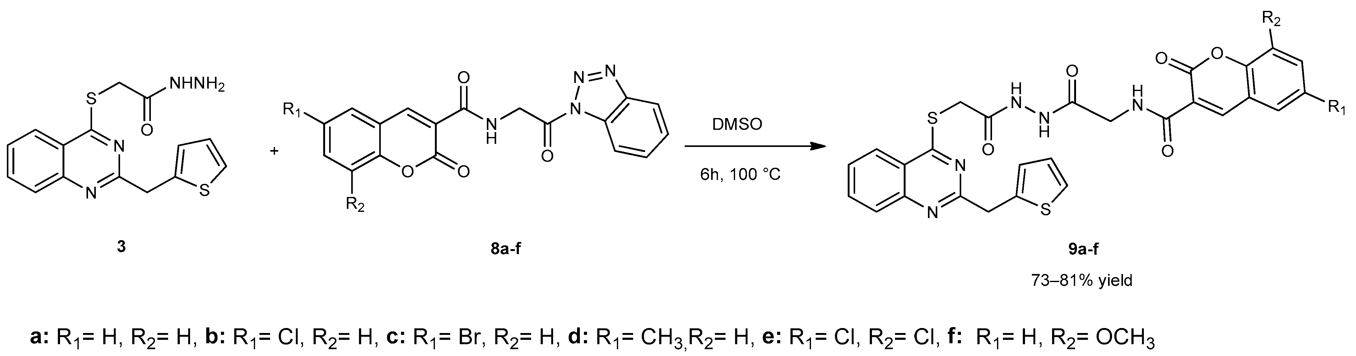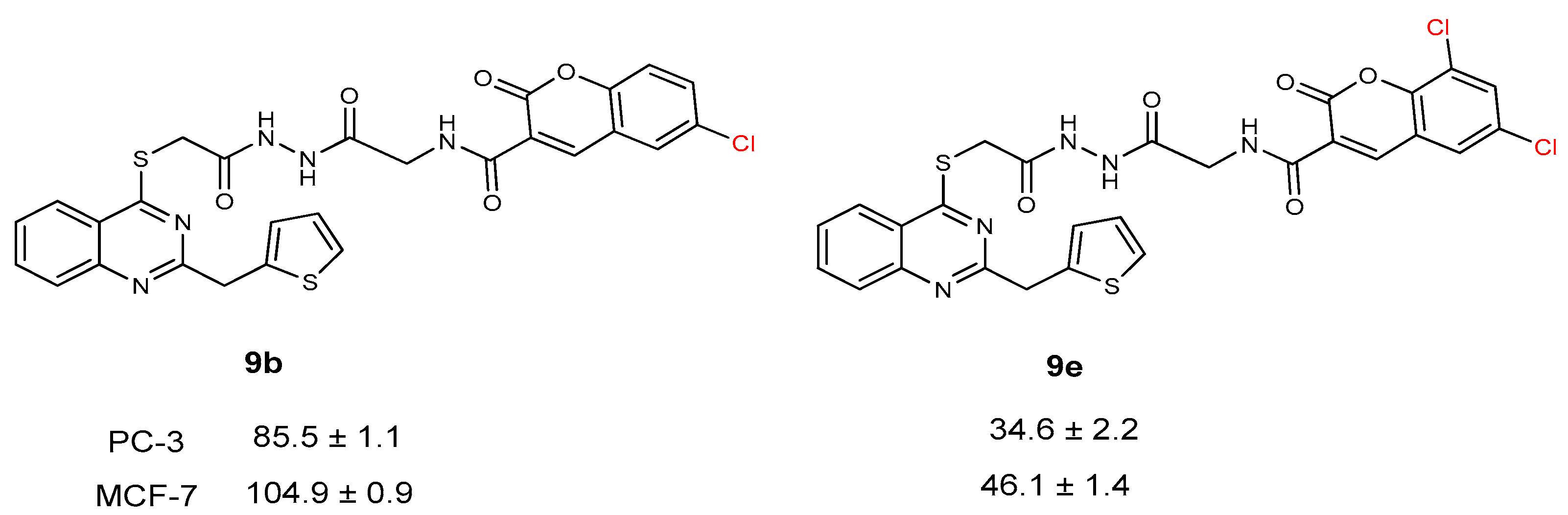 - Çalişkan, N.; Menteşe, E.; Yilmaz, F.; Ilhan, M.S. Synthesis and Anticancer Activities of Amide-Bridged Coumarin–Quinazolinone Hybrid Compounds. Russ. J. Org. Chem. 2024, 60, 918–926. [Google Scholar] [CrossRef]
