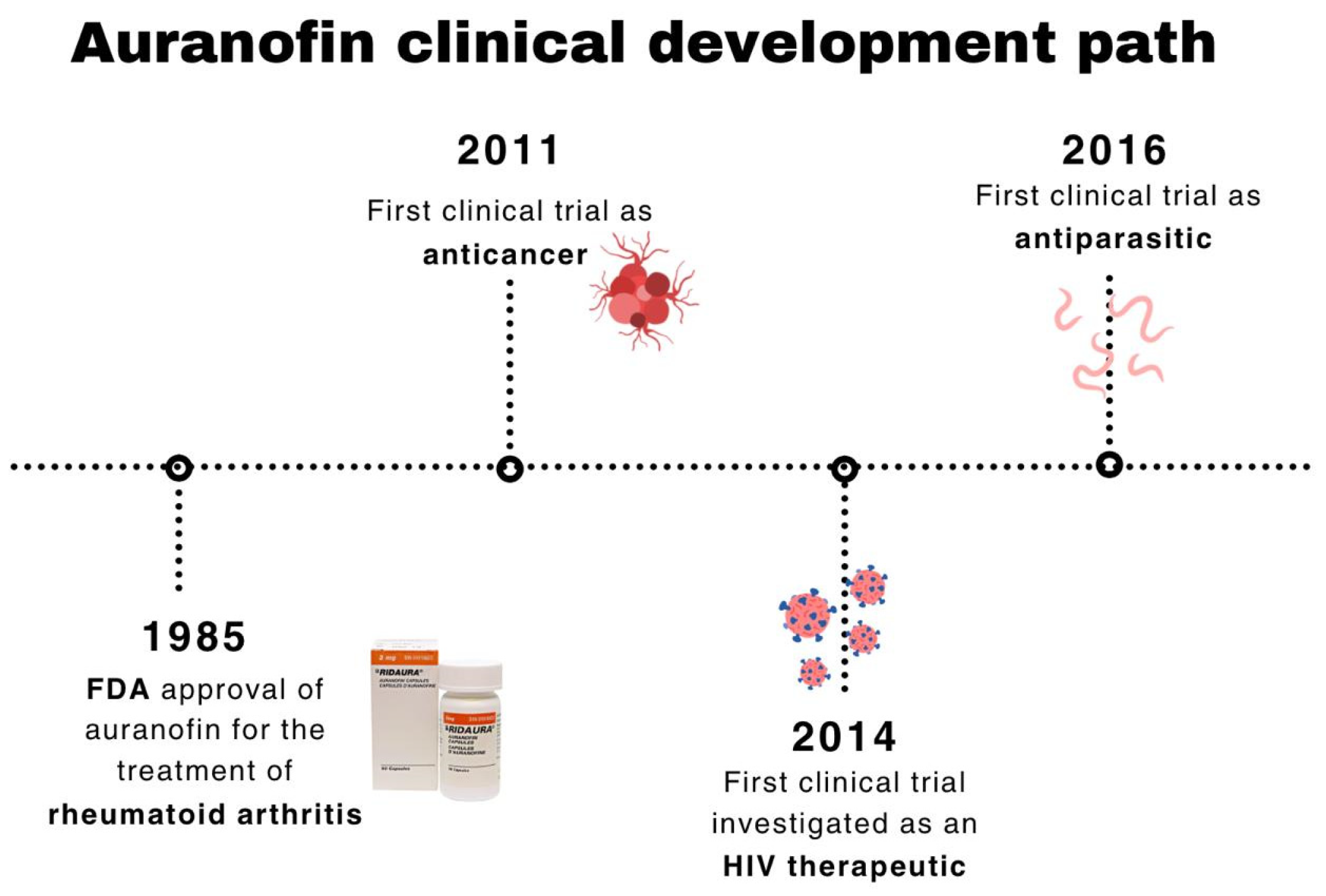 - Yamashita, M. Auranofin: Past to Present, and Repurposing. Int. Immunopharmacol. 2021, 101, 108272. [Google Scholar] [CrossRef]