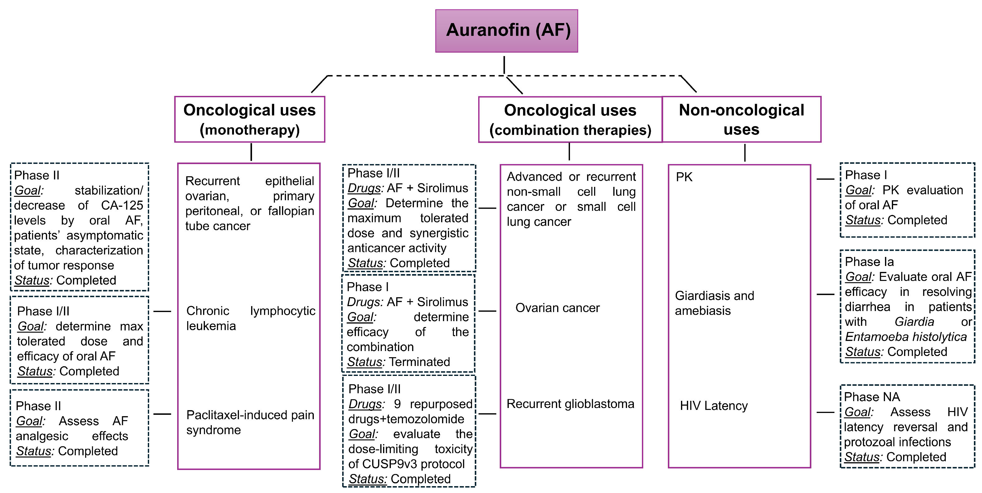 2.1. NCT01747798—Auranofin in Treating Patients with Recurrent Epithelial Ovarian, Primary Peritoneal, or Fallopian Tube Cancer https://clinicaltrials.gov/study/NCT01747798 (Accessed on 20 July 2025)