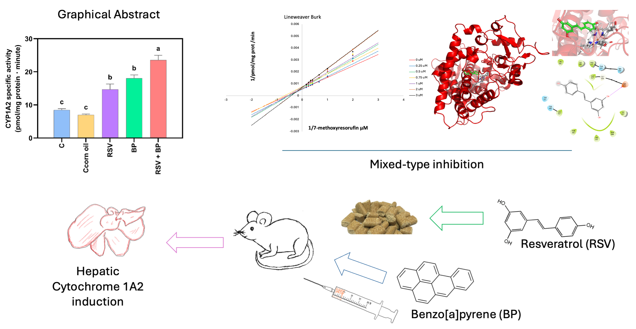 Here, we studied the effect of sub-chronic RSV oral consumption on the activity and protein concentration of non-induced and BP-induced rat hepatic CYP1A2, as well as the in vitro inhibition and enzyme kinetics of MROD activity in rat liver microsomes and human recombinant CYP by RSV. In silico studies of the interaction of RSV with CYP1A2 were also included.