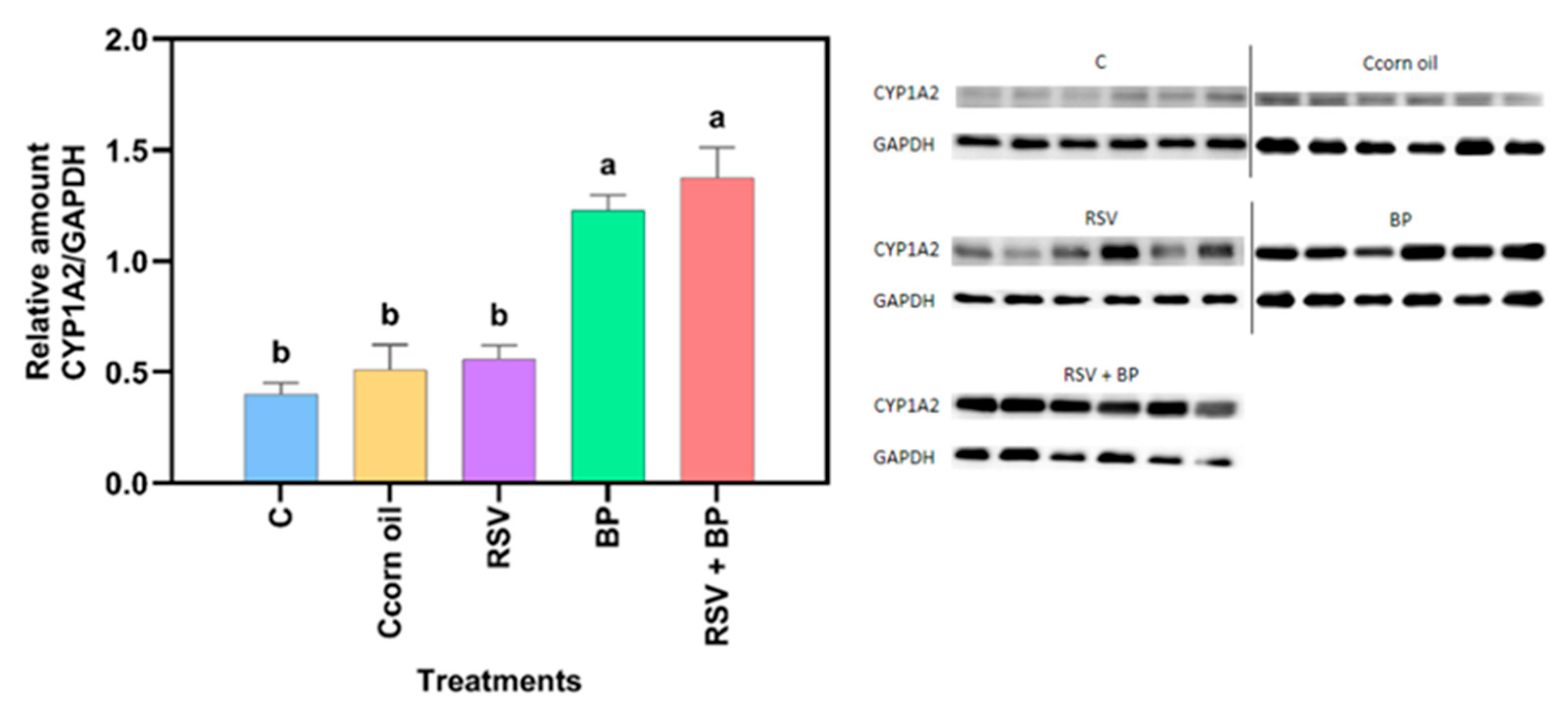 We cannot rule out physiological confounders resulting from the weight gain reduction observed in the RSV-treated group, which could account for its CYP1A2-induced activity alone or in combination with BP. Nevertheless, no modulation of CYP1A2 activity related to weight loss alone has been reported. Additional experiments should be conducted to clarify the mechanism behind RSV’s induction properties.