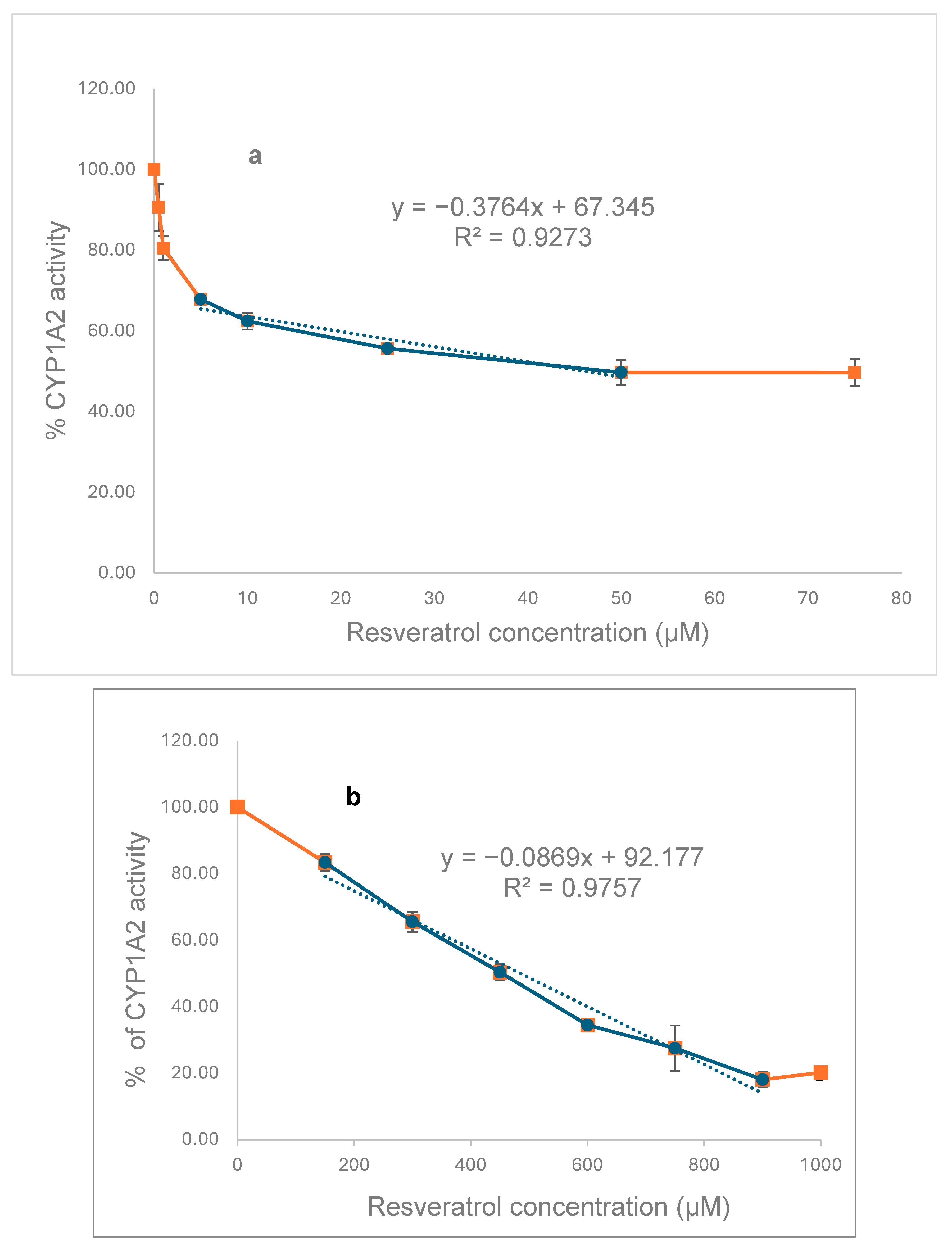 2, pH 7.6), substrate (methoxyresorufin 12.5 µM in DMSO), hepatic microsomal protein (150 µg/well) or human recombinant CYP1A2 (100 µg/well), and resveratrol dissolved in DMSO at the desired concentrations. An incubation mixture with the vehicle DMSO was evaluated as a control (100% CYP1A2 activity). The final concentration of DMSO in the incubation mixture was 5%. This concentration of DMSO alone caused 13% inhibition. The microplate was incubated at 37 °C for 3 min. Then, the reaction was initiated by adding 2.5 mM NADPH. Fluorescence measurements were performed every 20 s for 40 min at excitation and emission wavelengths of 530 nm and 585 nm, respectively. CYP1A2 activity was calculated with a standard curve of resorufin (5–500 pmol/mL), and the results were expressed as pmol/mg prot/min or as a percentage of the activity of the control. The percentage of AROD activity was calculated relative to that of the vehicle (DMSO), which was assumed to be 100%. The resveratrol concentration that produced 50% inhibition in AROD activity (IC