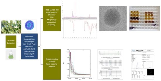 - Prevete, G.; Donati, E.; Ruggiero, A.P.; Fardellotti, S.; Lilla, L.; Ramundi, V.; Nicoletti, I.; Mariani, F.; Mazzonna, M. Encapsulation of Olea europaea Leaf Polyphenols in Liposomes: A Study on Their Antimicrobial Activity to Turn a Byproduct into a Tool to Treat Bacterial Infection. ACS Appl. Mater. Interfaces 2024, 16, 68850–68863. [Google Scholar] [CrossRef]