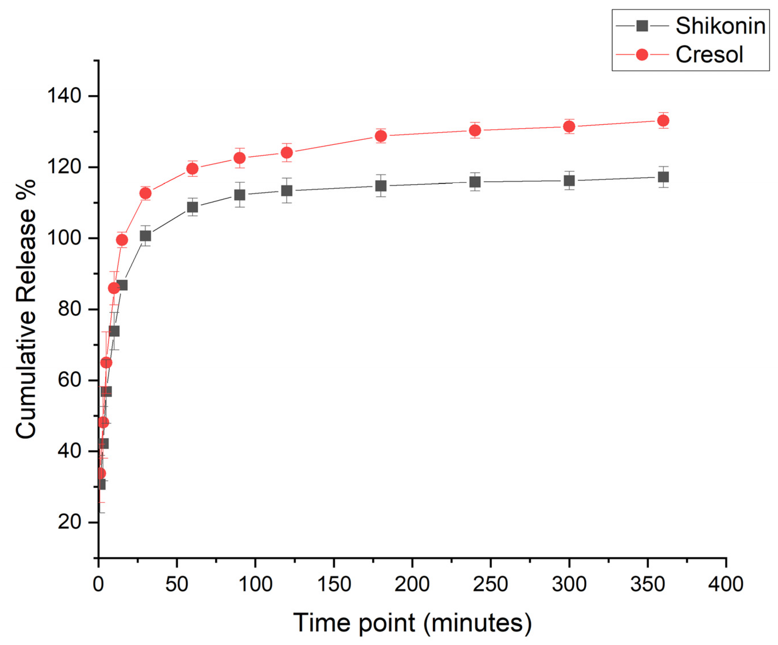 Alsulaihem, F.M.; Bakr, A.A.; Alnefaie, M.K.; Alshabibi, M.A.; Alshehri, A.A.; Almughem, F.A.; Alsudir, S.A.; Alamer, A.A.; Alshehri, B.Y.; Alzahrani, D.A.; et al. Coaxial Electrospun Nanofibers of Shikonin and Cresol as Antibacterial Wound Dressing. Pharmaceuticals 2025, 18, 1642. https://doi.org/10.3390/ph18111642