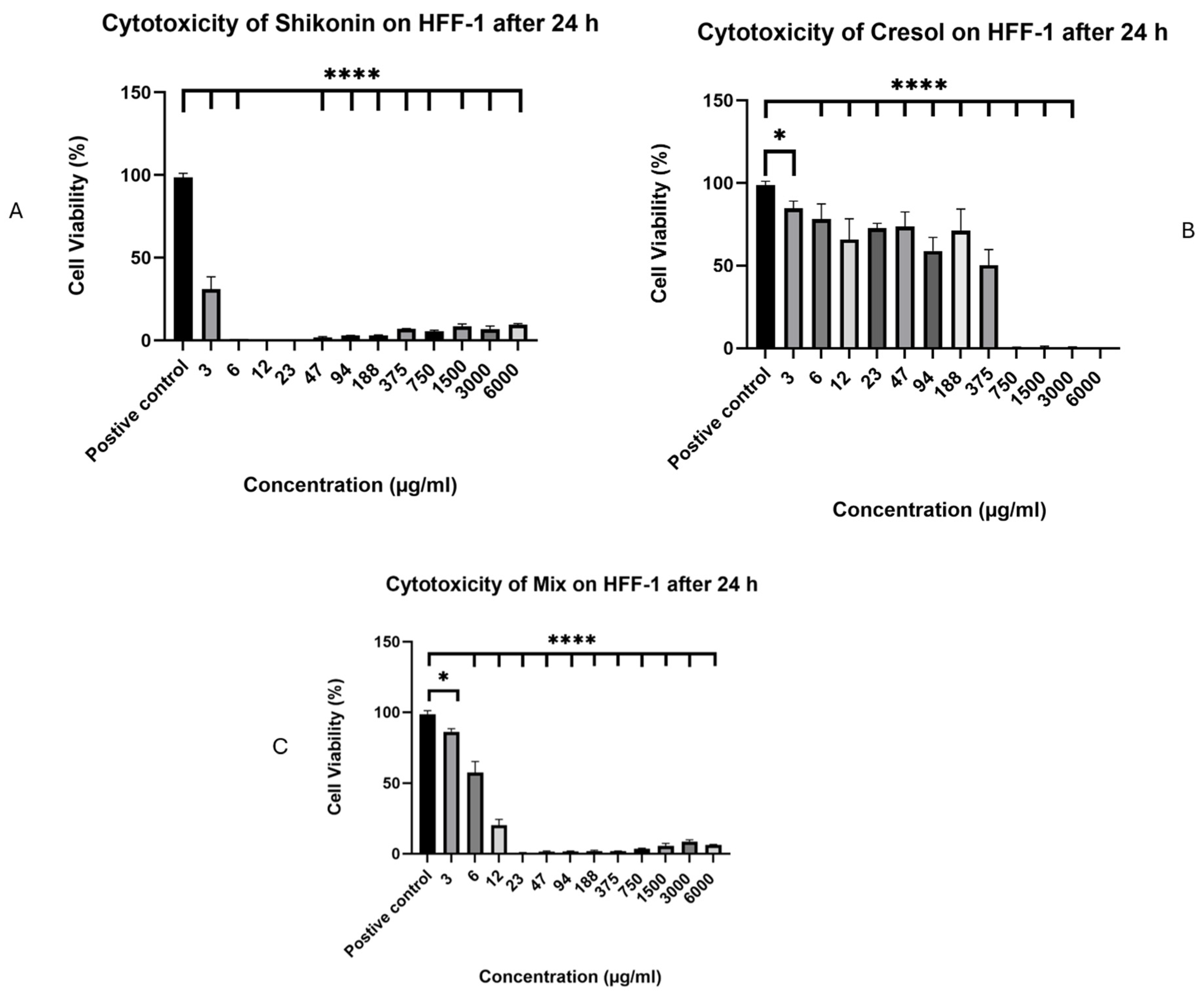 | Strains of Bacteria | Shikonin (μg/mL) | Cresol (μg/mL) | Mix (μg/mL) |