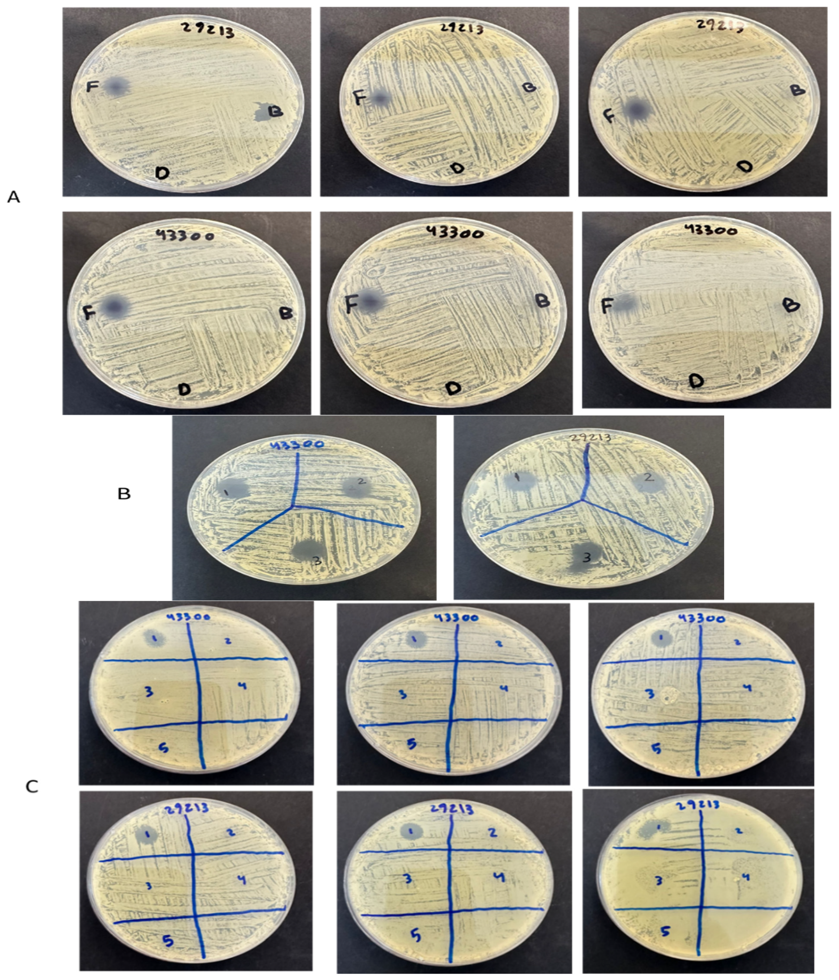| MRSA—ATCC 43300 | 13 mm | 10 mm | 0 mm | 9 mm |