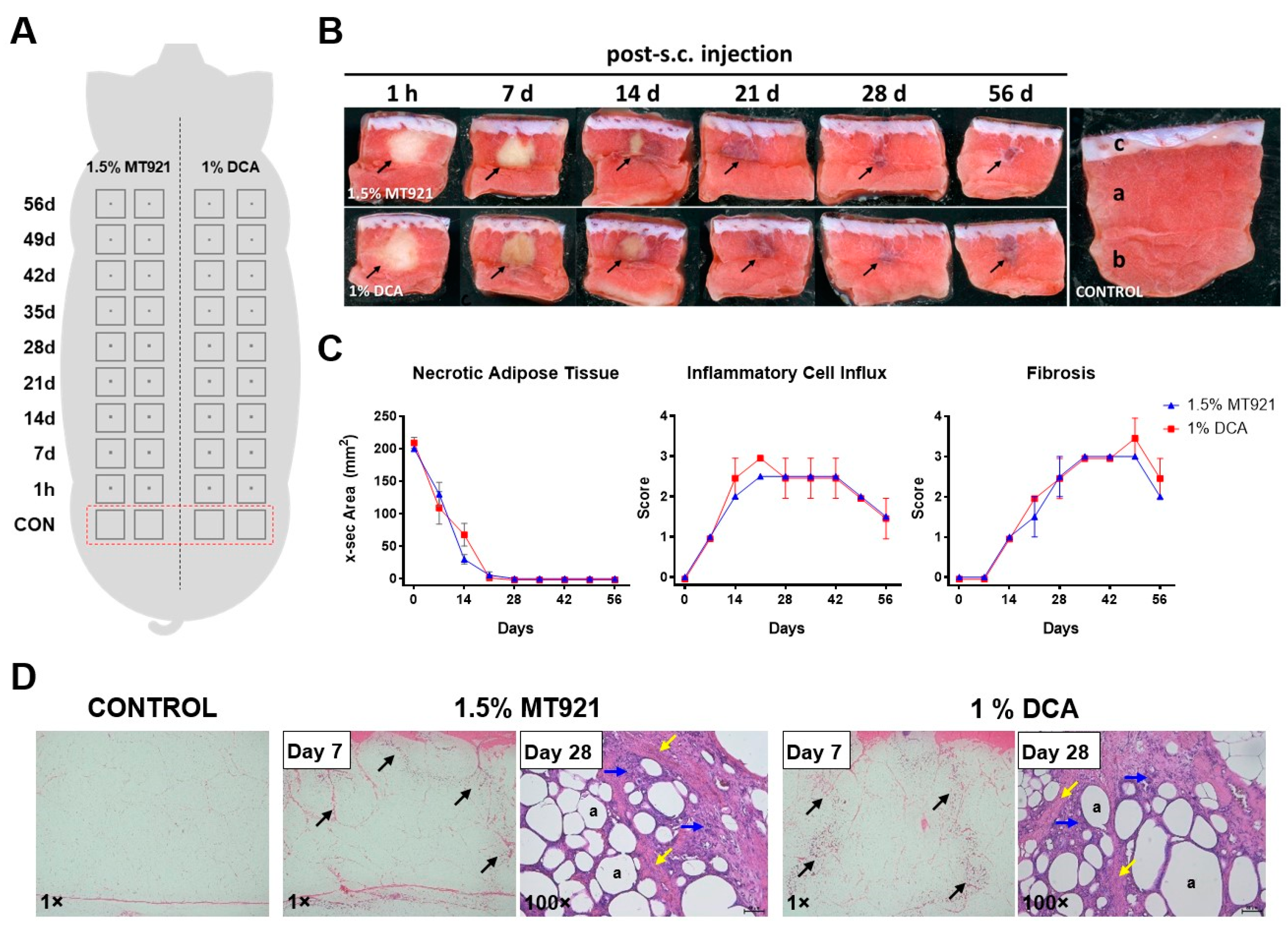 | Mini pig (MICROPIG) | 1 | 1.5% MT921, 1% DCA | Single s.c. injection at multiple dorsal sites | Sequential histopathology (necrosis, fibrosis, inflammation) | Day 1–56 |