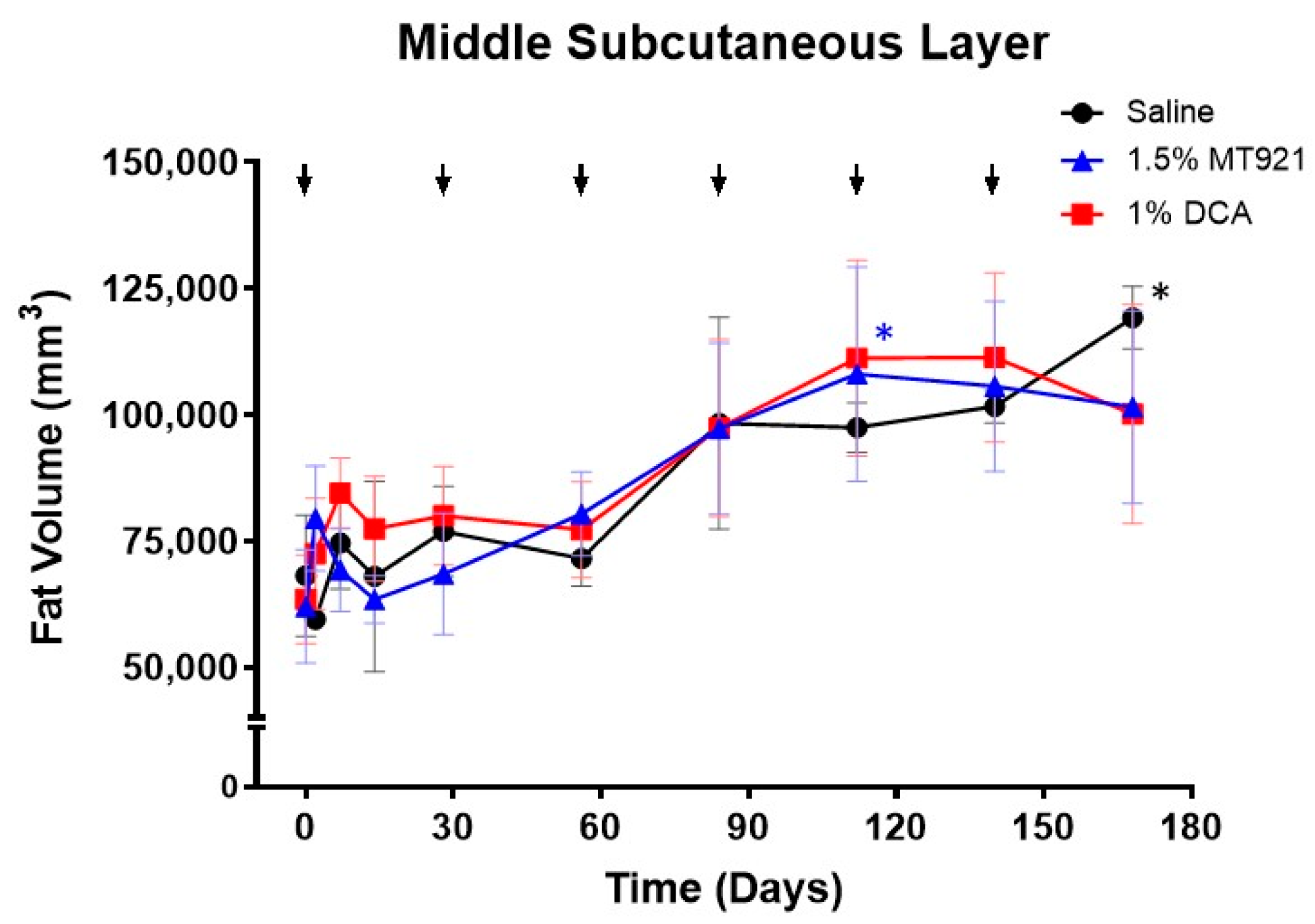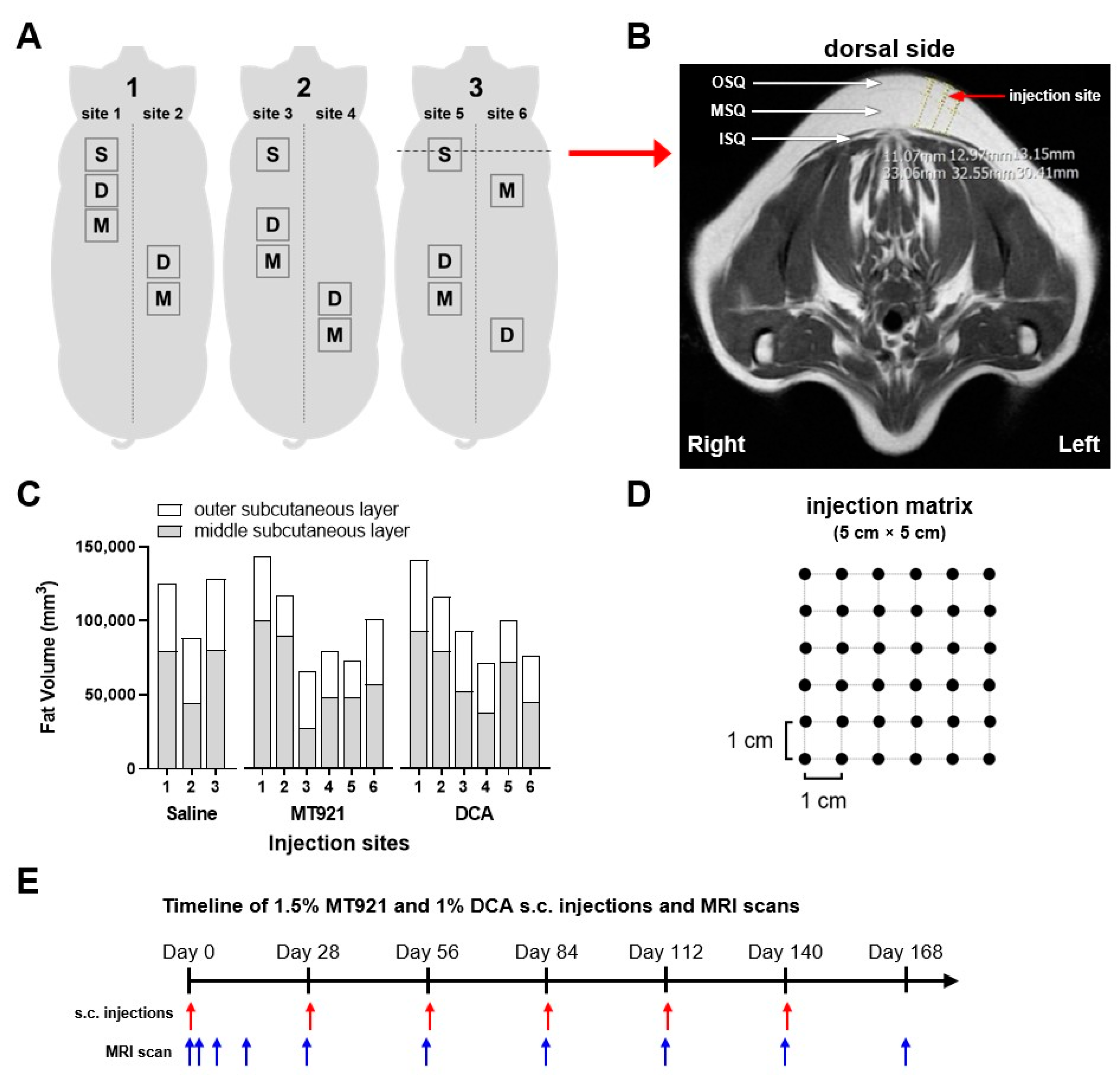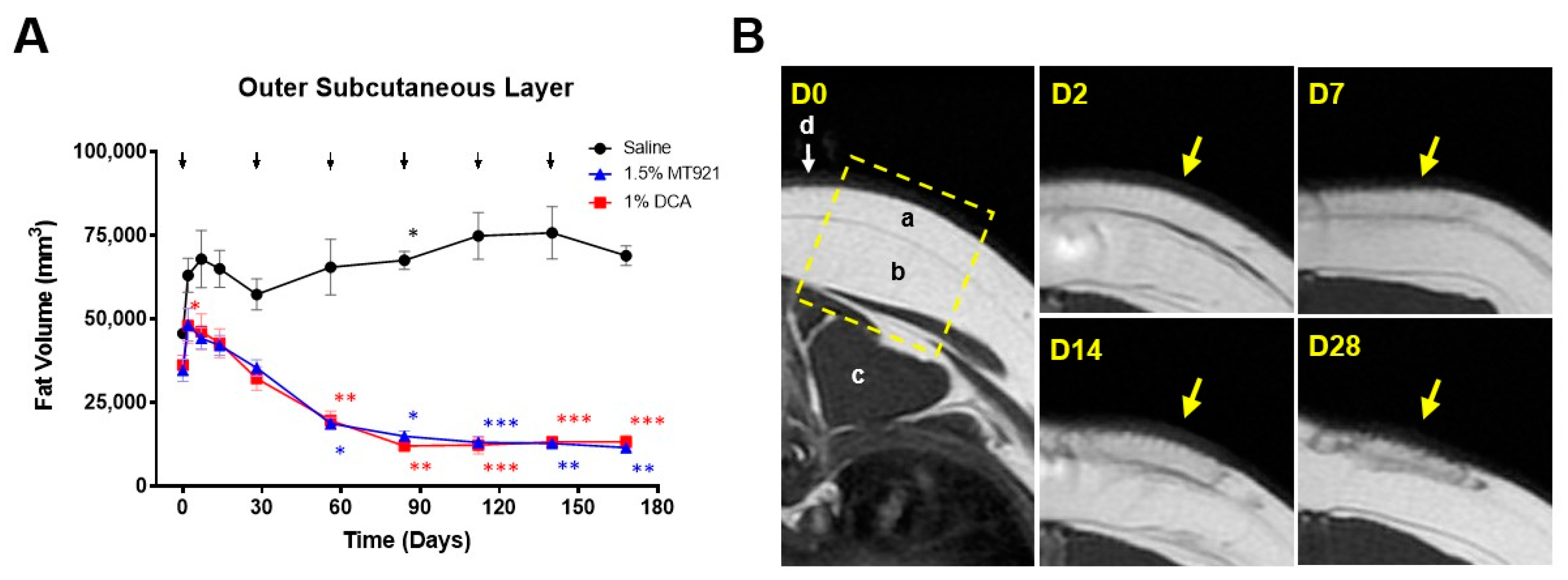 | Mini pig (MICROPIG) | 3 | 1.5% MT921, 1% DCA | 36 s.c. injections (5 cm × 5 cm matrix at multiple dorsal sites) every 4 weeks × 6 times | MRI fat volume change, local ADRs | Up to day 168 |