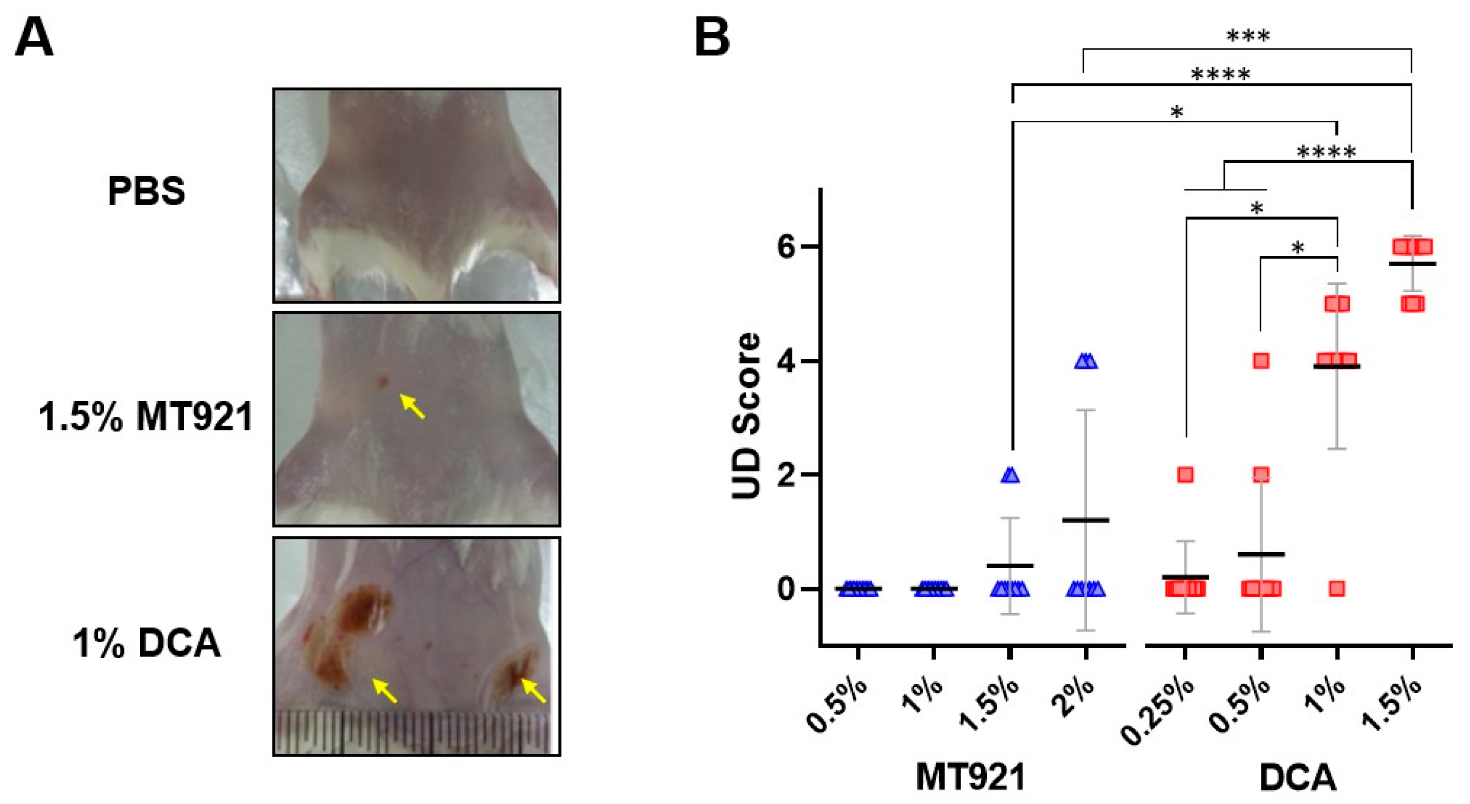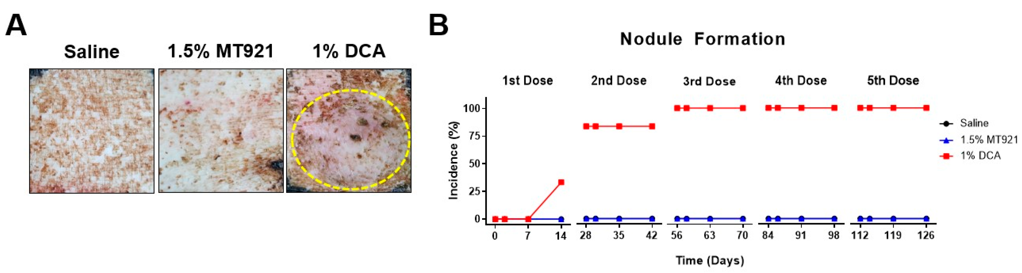 | Mouse (ICR/CD1) | 5/group | MT921 (0.5%, 1%, 1.5%, and 2%), DCA (0.25%, 0.5%, 1%, and 1.5%) | Single s.c. injection at left and right dorsal sites on day 0 and 2 | Ulcerative dermatitis scoring | Day 5 |