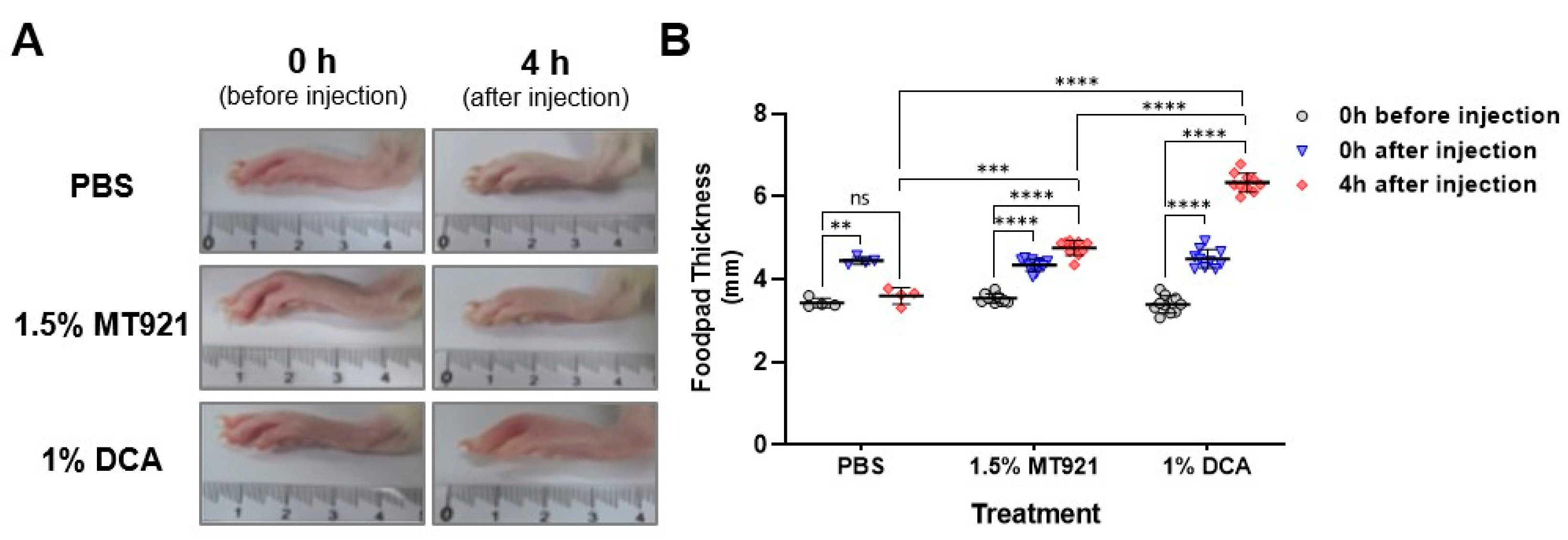 | Rat (Sprague–Dawley) | 5/group | 1.5% MT921, 1.0% DCA | Single intraplantar injection on both hind paws | Footpad edema (thickness) | 4 h |
